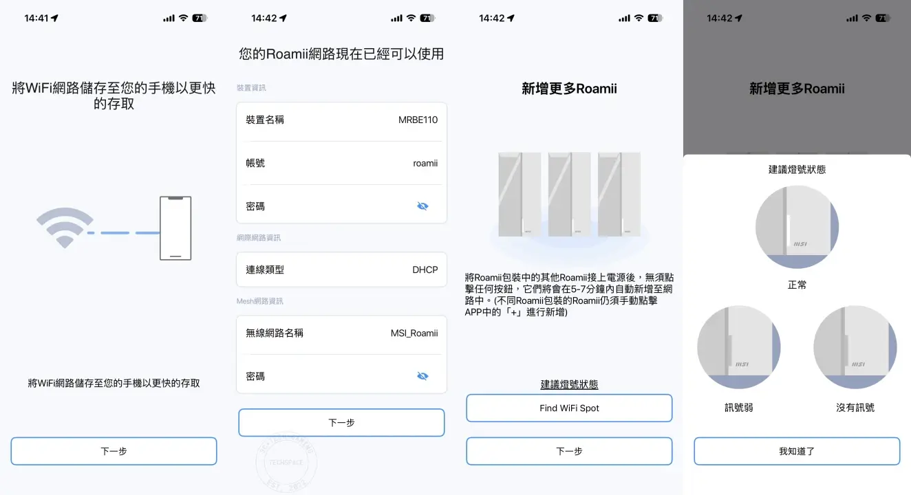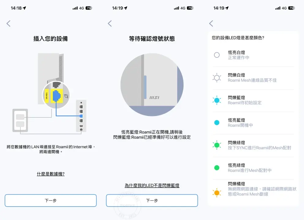當機器燈號顯示就緒後,App 會自動跳出提示,引導你的手機連上印在機身底座貼紙上的預設 WiFi 網路(例如畫面中的 MSI_16 或 MSI_0C)。連線成功後,系統就會啟動超有科技感的雷達掃描介面,自動且精準地尋找到你的 Roamii 路由器節點!