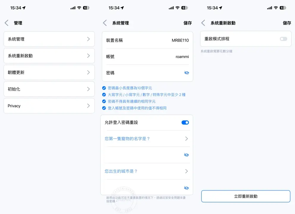 進入系統管理頁面,這裡可以隨時修改後台登入密碼與安全問題。最貼心的是「系統重新啟動」功能,它不僅能一鍵重開機,還支援「排程重啟」!你可以設定在半夜無人上網時自動重啟設備,確保路由器隨時保持在最佳的滿血狀態。