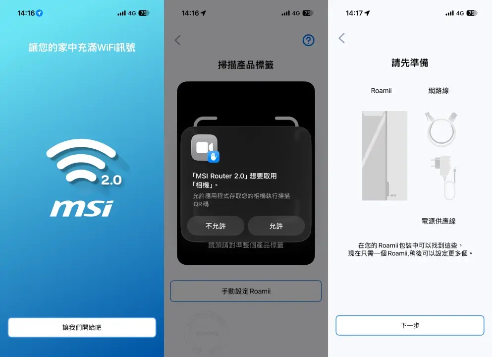 下載並開啟專屬的「MSI Router 2.0」App 後,跟著畫面指示走就對了!首先只需允許相機權限,直接掃描機身背面貼紙上的 QR Code,接著 App 就會貼心地以圖解方式,提示你接下來需要準備的線材與配件,對 3C 新手來說超級友善。