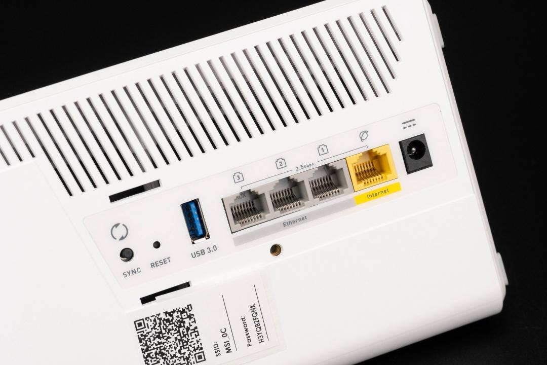 放大來看這誠意滿滿的 I/O 介面!除了必備的 Sync 同步按鈕、Reset 重置孔與一組實用的 USB 3.0 連接埠外,最亮眼的就是一口氣給足了 4 個 2.5Gbps 超高速有線網路孔(包含 1 個 WAN 與 3 個 LAN)。這配置能完美釋放光世代的大頻寬,絕對是 NAS 玩家與重度電競主機的最佳拍檔!