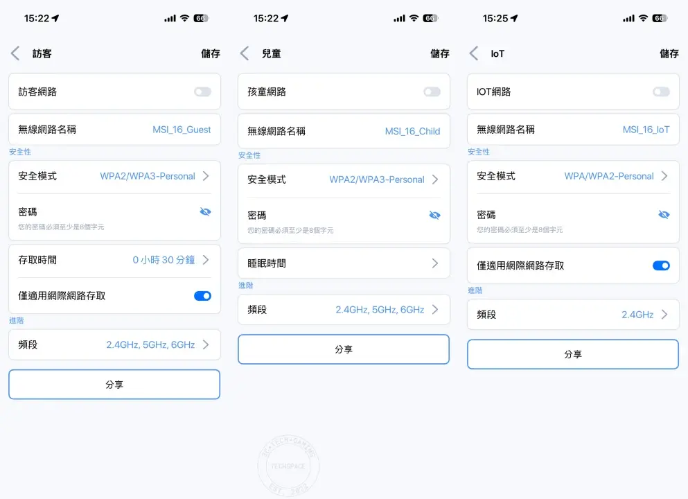 控制介面中也允許為「訪客」、「兒童」與「IoT 物聯網設備」獨立建立專屬的 WiFi 名稱。不僅能將智慧家電鎖定在穿牆力最好的 2.4GHz 頻段,還能將它們與主要網路隔離,大幅提升居家網路的整體安全性。