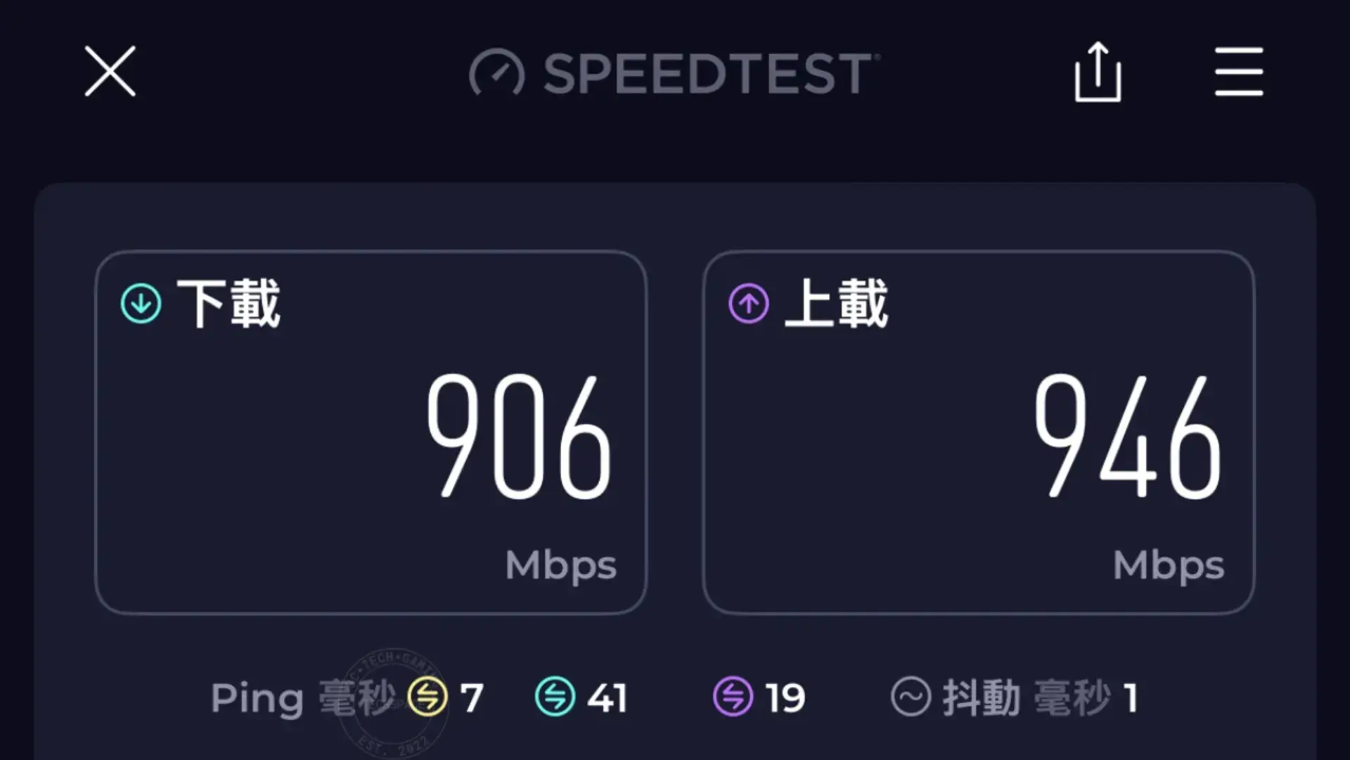 我們緊接著拿出了同樣支援 WiFi 7 規格的 iPhone 16 Pro 進行手機版 App 測速。其下載來到了 906 Mbps,上傳更是直逼 946 Mbps,且 Ping 值依舊穩如泰山(7ms)。