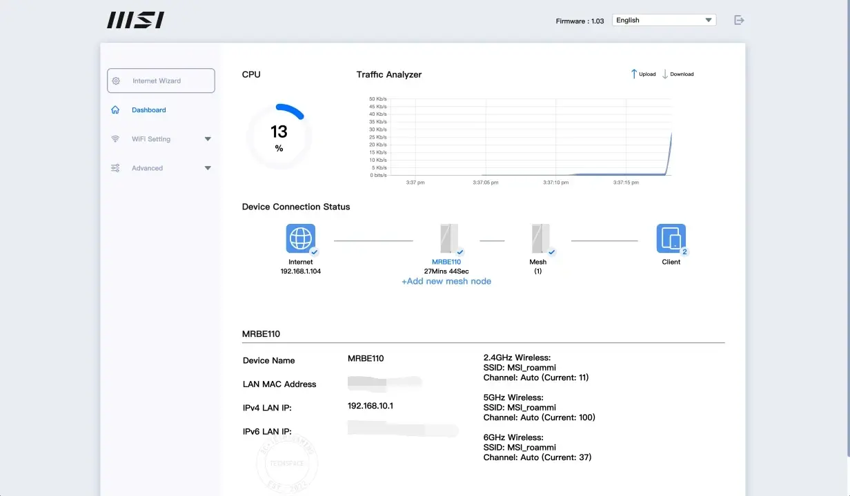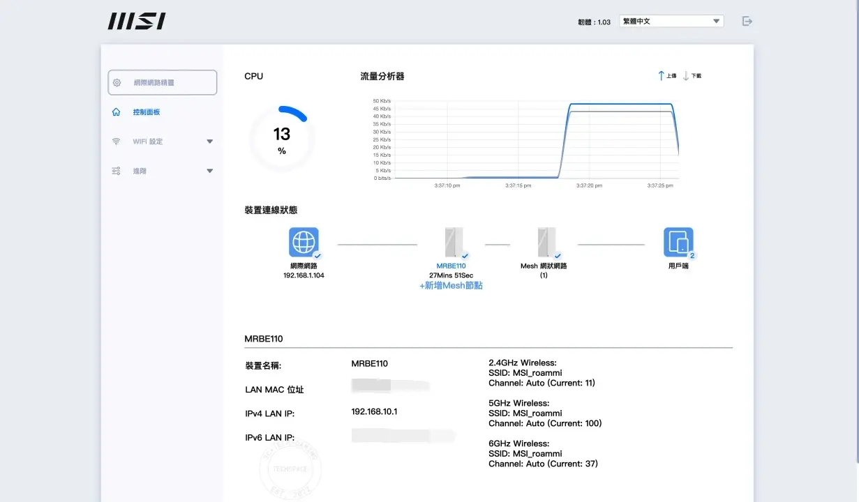 進入 Dashboard(控制面板)首頁,一目了然的儀表板設計非常具有專業感!左側顯示了 CPU 的即時負載狀態,中間有動態的網路流量分析圖,下方更是直接畫出清晰的設備拓樸圖,哪台設備連著哪台 Mesh 節點,一眼就能掌握。