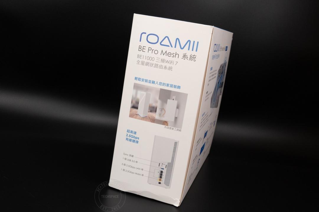 MSI Roamii BE Pro 的外包裝採用極簡清新的藍白配色,斗大的 WiFi 7 標誌與 11Gbps 總網速直接宣告了它的旗艦級實力!我們這次評測的主角正是能輕鬆搞定大空間的「兩入組」版本。