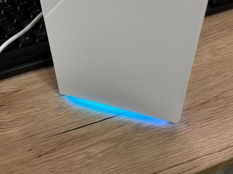 翻到機身底部,特殊的三角形底座四周配置了防滑橡膠墊與進氣孔。而底部的外圍邊緣更是大有玄機,這裡隱藏了能自訂效果的 RGB 氣氛燈效設計。無論是想營造熱血的電競感還是溫馨的居家風,都能透過燈光為空間增添專屬氛圍。