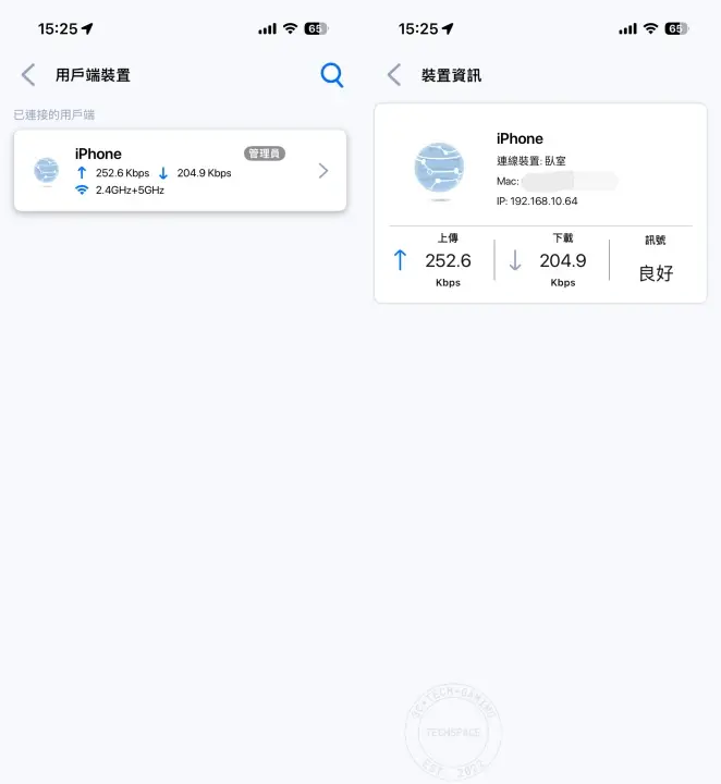 家裡網路變慢不知道是誰在搞鬼?點進用戶端裝置後,所有連線設備的狀態清清楚楚!也能進一步查看當前裝置的流量。不管是設備當下吃掉多少頻寬、使用了哪些頻段(例如圖中同時連接 2.4GHz+5GHz),甚至是訊號強弱都能精準監控,揪出網路吃油怪獸超簡單。