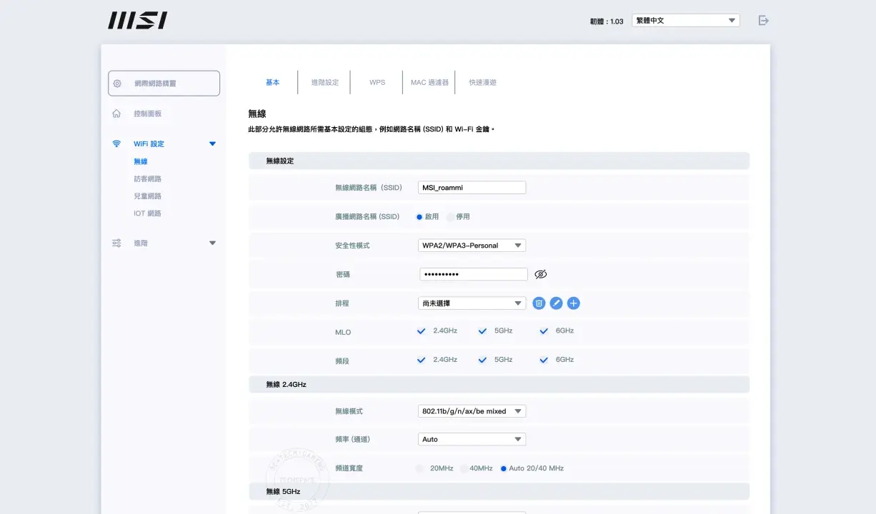來到「WiFi 基本設定」頁面,這裡就是釋放 WiFi 7 猛獸火力的關鍵!你可以針對 2.4GHz、5GHz、6GHz 三個頻段獨立勾選是否啟用 MLO(多重連線),也能在這裡將不同頻段的 WiFi 名稱分開設定,滿足各種舊型物聯網設備的連線需求。