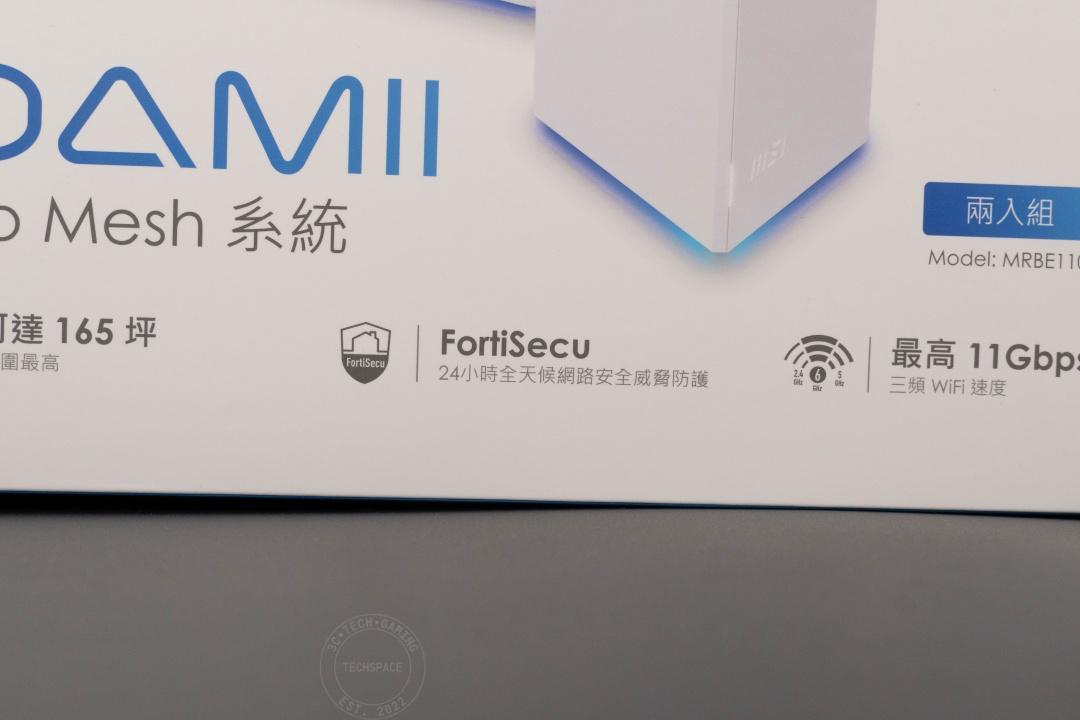 盒裝下方直接標示雙入組最高可達 165 坪(約等於官方標示的 6,000 平方英尺 )覆蓋範圍,不管是百坪大宅還是多樓層透天厝都能輕鬆駕馭。也特別強調了內建由的 MSI FortiSecu 防護技術,能為家中的所有連網設備提供 24 小時全天候的企業級資安守護。另外也有標示型號 MRBE110 支援最先進的 2.4GHz、5GHz、6GHz 三頻 WiFi 傳輸,最高網速可狂飆至 11Gbps。