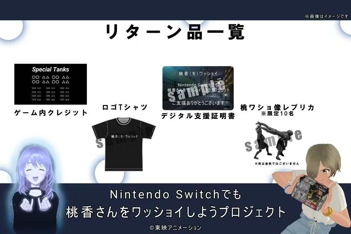 群眾募資回饋設計方面,這次專案整體走的是粉絲收藏加上參與感路線。基礎的 1,000 日圓方案可獲得支援證明書,3,000 日圓方案則增加遊戲內小型感謝名單,10,000 日圓方案再往上加入《桃香(を)ワッショイ》Logo T 恤,30,000 日圓方案則升級為大型感謝名單。若是想追求更高收藏價值,100,000 日圓的高階方案還會附上「桃ワショ像」複製模型。