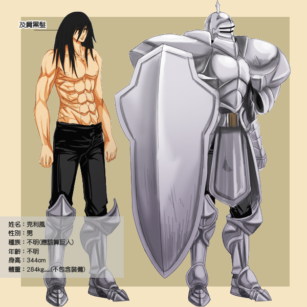 【人物介紹】 在西方大陸中偏遠的一個小城裡,被眾多城主的攻擊之下仍就安然無恙,原因是因為這座城裡有著一位強大的守護者---要塞騎士,那誇張般的重甲與體型,在敵人面前刀劍無效,甚至放箭射也射不穿,用魔法卻也打不破那重甲,那重甲不是一般金屬所打造出來的,是用一種帶有魔力的金屬下去製成,有著連魔法都能減緩傷害的效果。 雖然有著要塞騎士的封號,但是其職位還是屬於士兵階級 在鄰國的聯合攻擊之下以及城內的大臣謀反,在全城都是敵人的狀態之下,以著非常人的力量與意志力,力拼大軍,但還是保護不了城、伙伴更甚至保護不了那柔弱公主與對他發誓的城主,這一仗,對方的聯合軍死傷慘重,一片屍海中站著一名全身鎧甲都被鮮血染紅的騎士,右手拿著巨大的單手劍插在地上支撐著身體,左手還是死命拿著巨盾,此時下大雨了,把那身上的深紅洗淨,磅礡的雨聲中似乎可以聽到重騎士的哭喊與嘶吼聲。 在那之後,重騎士獨自一人來到阿斯嘉特。 |
