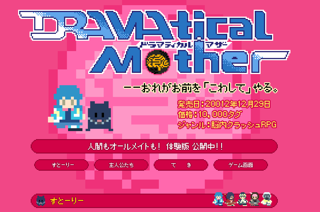 這次B+C社首度推出腦內崩壞RPG(脳内クラッシュRPG),也公佈了故事與世界觀,以及主要人物介紹。遊戲的第一印象便是其風格獨特的遊戲畫面,使人大感驚奇。同時遊戲官網搶先釋出了線上體驗版,要讓玩家能夠搶先體驗。