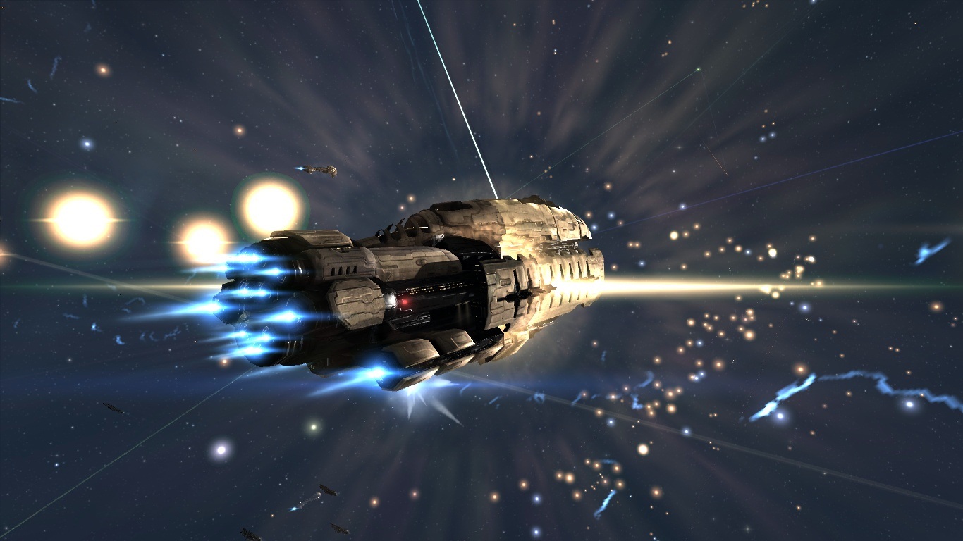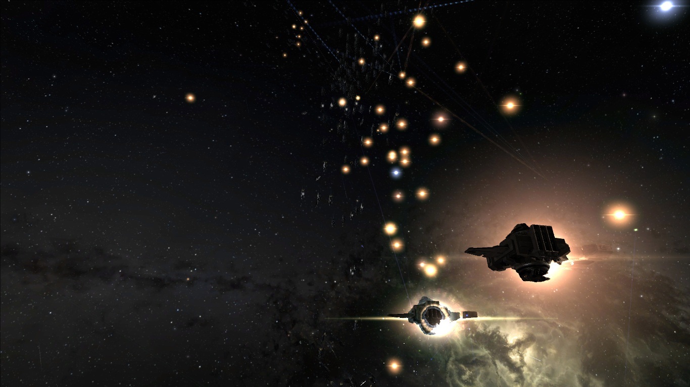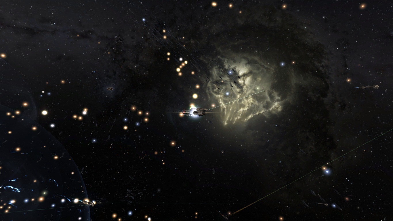 任務巡邏中的艦隊群,上方光線為後勤艦進行遠程維修時所出現的特效。