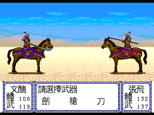 下面是武將單挑的畫面,一進來就要先選武器,這時候可以看到武將手上的武器會跟著改變