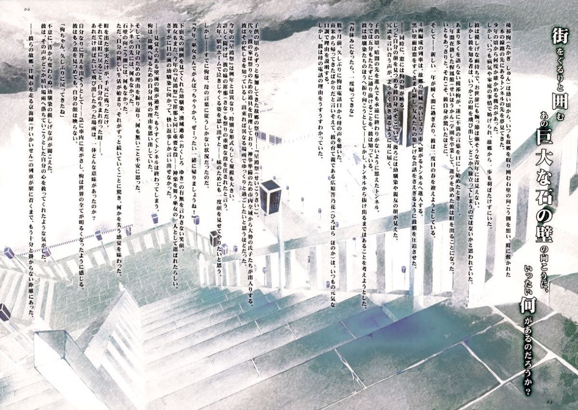 主人公‧稜祁恂(たかぎしゅん)從小便在包圍著故鄉的岩壁前憧憬著對面,一直夢想見到鋪於小鎮裡的那條筆直的隧道的彼方。