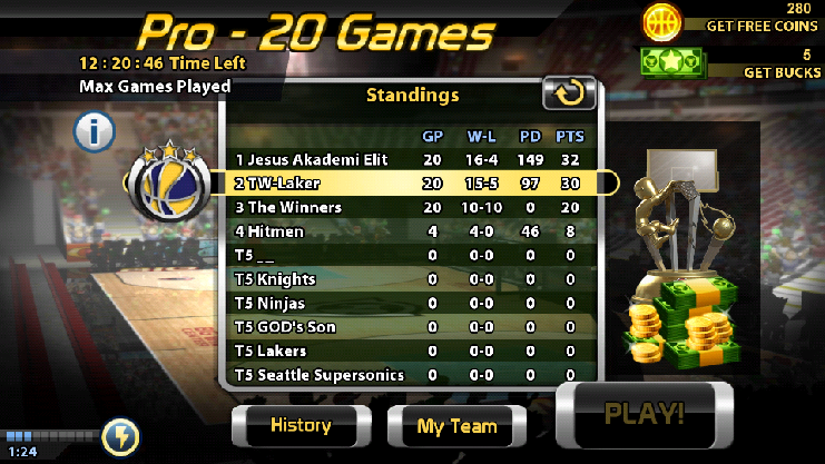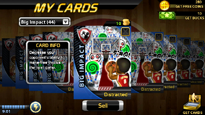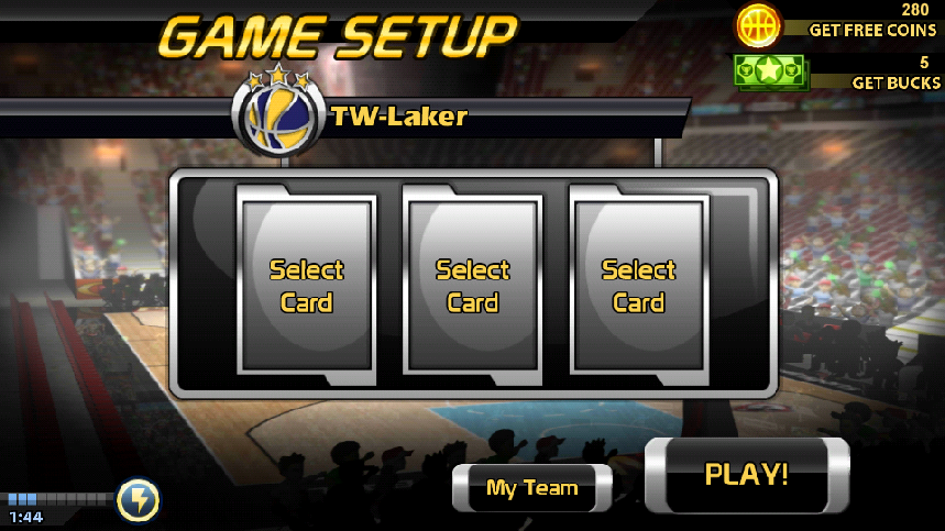贏一場可獲的PTS2點輸則沒有,該組內PTS最高者即為冠軍,若PTS相同則比較PD,PD是每場的輸贏比分累計,前5名皆可獲的鈔票及金幣,名次越前面獎勵越多第1名有獎盃,遊戲開始前會進入卡片設定,可設置三張戰術卡來提升自己的獲勝機會,戰術卡有很多種例如干擾罰球卡、火鍋卡、抄截傳球卡等等,戰術卡有互相剋制配合效果,好好選用才能獲得勝利。