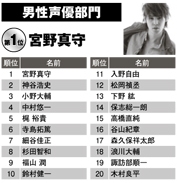男性聲優部門 1位 宮野真守 2位 神谷浩史 3位 小野大輔 4位 中村悠一 5位 梶裕貴 |