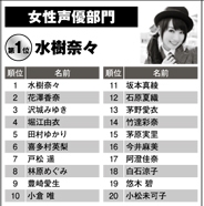 女性聲優部門 1位 水樹奈奈 2位 花澤香菜 3位 澤城美雪 4位 堀江由衣 5位 田村ゆかり |