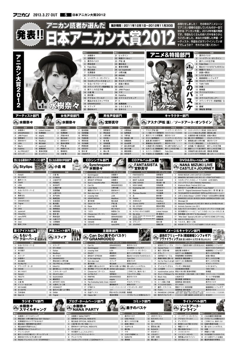 歌手部門 1位 水樹奈奈 2位 GRANRODEO 3位 JAM Project 4位 宮野真守 5位 田村ゆかり |
