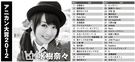 ANICAN大賞2012結果發表水樹奈奈獨攬8冠アニカン大賞 2012 1位 水樹奈奈 2位 宮野真守 3位 影子籃球員 4位 神谷浩史 5位 Fate/Zero |
