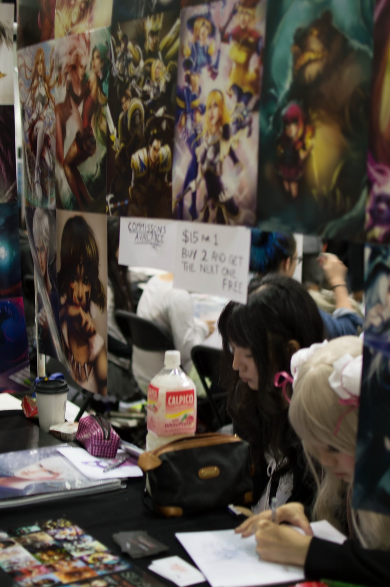 這次的動漫展還有一個跟台灣不一樣的是,同人誌在這邊似乎不是很流行,北美也有許多功力相當出色的繪師(有些作品在deviantArt上),但販賣的就都只是CG poster而不是故事創作類的同人誌。一張poster也要$15~20,所以我就什麼都沒買。展場內販售的大都是公仔,服飾,或一些官方的動漫商品。北美這邊東西也不便宜,一本設定集$40以上是常有的。有幸找到進口的同人誌一本也要$15以上。