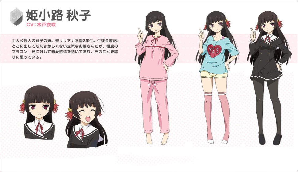 姬小路秋子(姫小路 秋子(ひめのこうじ あきこ),聲:木戶衣吹) 秋人的妹妹。聖莉莉安娜學園高中2年級生。外貌美麗品格優秀,學業成績優良。年幼時被秋人代受雙親扶養,但父母死後則被親屬,名門有栖川(ありすがわ)家接繼,與秋人分別被養育著。也因有栖川家的教育使得行為舉止得體,到哪裡也不會丟人。 極度的戀兄情節,對秋人抱擁愛慕之情,且毫不隱瞞,並盡其所能的對哥哥明示、暗示甚至直接行動。由於自認自己不適合配戴眼鏡,因此與秋人兩人相處時皆避之,但在學校時,仍會帶著眼鏡。容易被秋人套出內心話,緊張否認時會帶有關西腔,幻想時會發出咕嘿嘿的笑聲。 在中學部5年級時轉入聖莉莉安娜學園。現為聖莉莉安娜學園生徒會書記。新藤光一郎著作的愛好者。