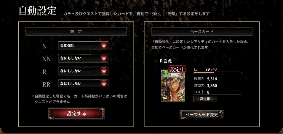 可以設定你要強化的對象,在地圖搜到或絆點抽到卡片時,可以依你設定以哪種等級的卡當作強化素材來自動強化。