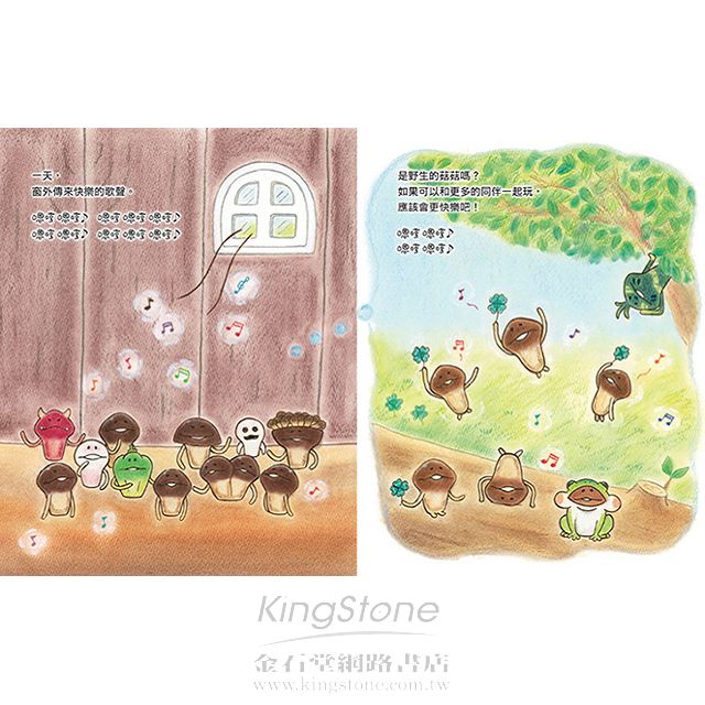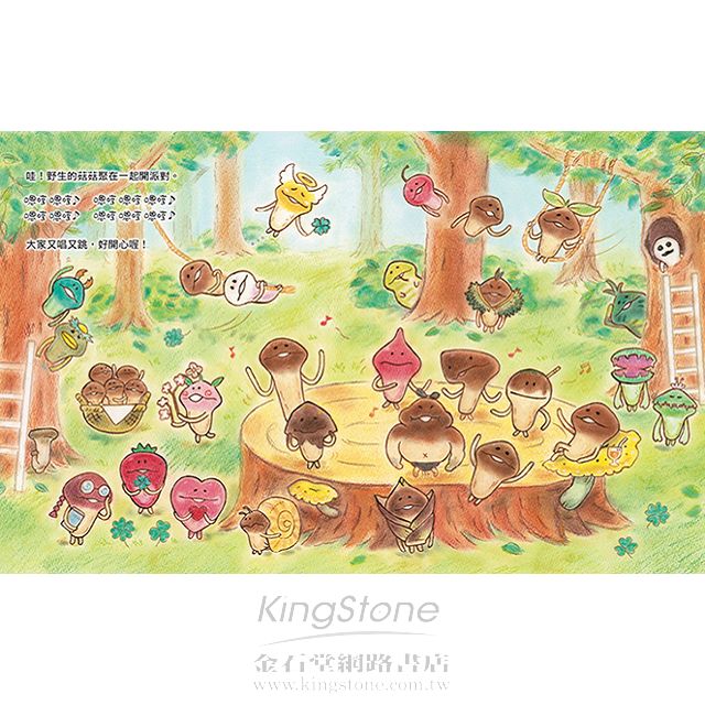 最受歡迎的可愛菇菇推出繪本囉!看各式各樣的菇菇們從原木上長出來,發出:「嗯哼!嗯哼!」的聲音,真是太可愛了!等一下,好像聽到森林中傳來美妙的音樂,原來是野生的菇菇們在開派對,趕快去加入他們吧!