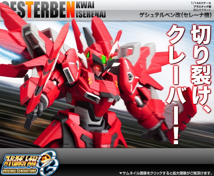 久違的機戰原創模型,壽屋終於確定發售,今年首發的機體是紅色的凱修拜特改(ゲシュテルベン改),而且是由原第三次超級機器人大戰α真實系女主角塞蕾娜(セレーナ)專用機體,紅黑色是個人風格,並附有專屬格鬥武器「カイリー・クレーバー」,平常時為雙短劍模式可攻擊也可收納在腳部,必要時可以合併成迴旋標模式做遠距離格鬥武器。預計2014年06月發售,日幣價格:7,800円(含稅)。