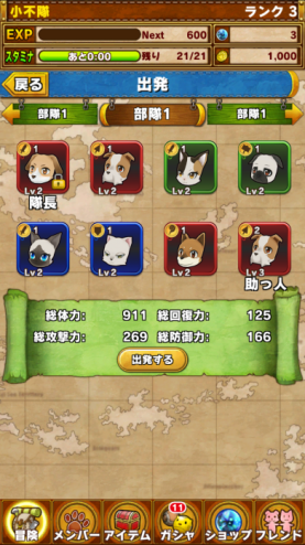 主介面的排序與一般的日本遊戲中沒有太大的差別。但在主介面會顯示自己隊伍當中的貓貓狗狗們,也可以點選他們來互動喔!