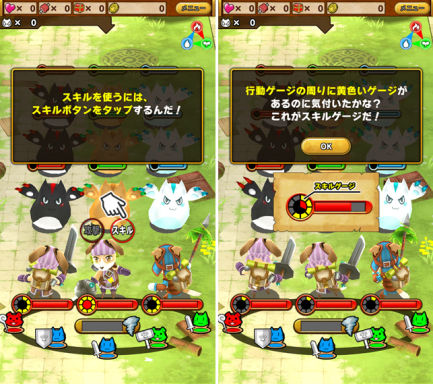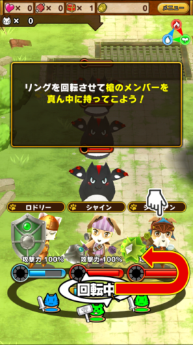 了解了基本的玩法後,就要開始進攻了!每一個夥伴的下方都有行動時間,行動時間分為兩種:行動能量及技能能量。中間的小圈圈如果顏色全滿時就可以行動,外圍的大圈圈則代表技能發動的能量,適用技能時會告訴你所消耗的能量格式多少再決定要不要使用。
