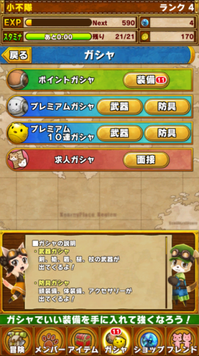 遊戲中可以抽取武器/防具及貓狗夥伴喔!武器/防具可以單抽或是10連抽,一次消耗5個魔石。底下還有列出各個星等抽取機率。