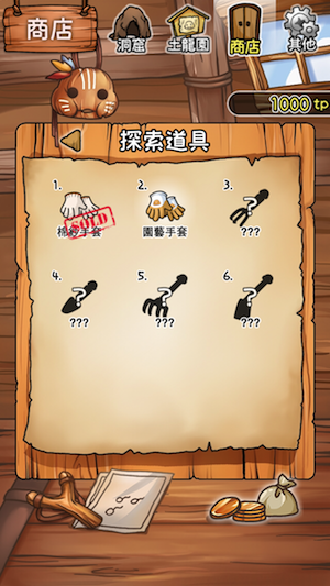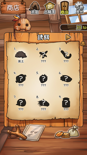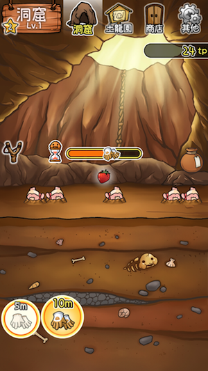 $「洞窟」裡,玩家們可以使用各種不同的探索工具,像是【園藝手套】、【小土鏟】、或【大釘耙】來挖掘,再搭配各式各樣的誘餌,例如【草莓】、【牛乳】...等,來進行探索,就能誘捕到獨一無二的土龍喔~ 當然一開始玩家只有最基本的探索工具,在累積tp點數後,就可以去遊戲中的商店添購各式各樣的工具以及趣味十足的誘餌囉!