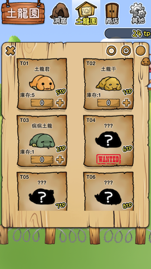 但如果太久沒回到洞窟,洞窟可是會變得髒亂不堪,就連土龍也會跟著生病呢,因此若發現洞窟變髒了,就趕快清理乾淨吧!不過…髒亂的環境也或許是某些「特殊品種」的溫床也說不定喔!?(PS.另外要提醒玩家,若是太久沒來收成土龍,土龍可能會因為放太久乾掉變成土龍干了!仔細想想實在有點可憐。不過對於擔心自己會忘記收成的玩家們,遊戲也提供了鬧鐘的功能,只要開啟鬧鐘,當誘捕時間結束時就會提示你「該回來囉」!不過聽說在特定的條件之下,土龍干也有可能會變成其他的品種呢…說不定滿值得一試的!?)