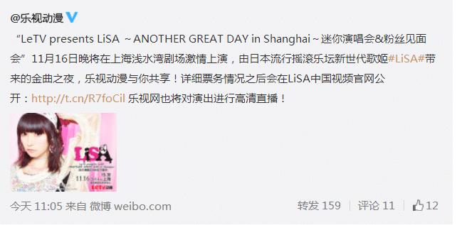 11月,LiSA將在上海舉行“LeTV presents LiSA ~ANOTHER GREAT DAY in Shanghai~