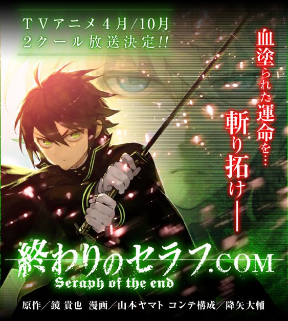 而最近《終わりのセラフ》也即將動畫化了。很特別的再播映前就宣布將要製作二季的動畫,將分別於 四月 和 十月 放送,製作公司方面請到了以《進擊の巨人》而聞名的「WIT STUDIO」來操刀,音樂部分也請到了「澤野弘之」進行編曲的工作,相信不管是視覺還是聽覺上的質量都是可以保證的。