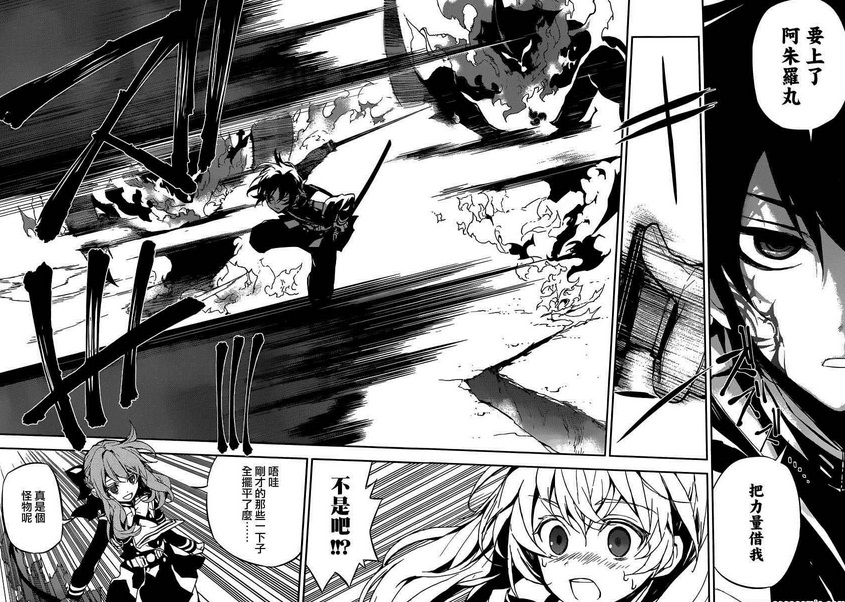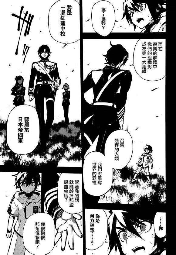 這邊則是第三位主角一瀨紅蓮的視點,紅蓮為日本帝國鬼軍的菁英月鬼組的中佐,也是優一郎的上司兼師傅的存在,但不同於其他王道作品僅類似教師的存在,一瀨紅蓮在作品中有屬於自己的想法和故事劇情。