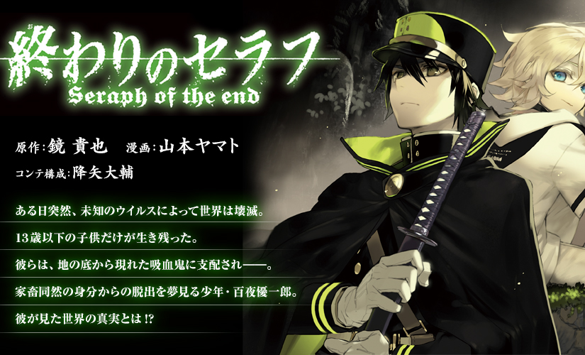 有一天整個世界因突如其來的未知病毒而毀滅,只有 13 歲以下的孩子不被病毒所感染,然後這些孩子們被從地底出現的吸血鬼所統治,並作為提供血液的家畜飼養。百夜優一郎和百夜米迦爾就是被抓住的孤兒們之一,而他們在計劃著逃亡與復仇……