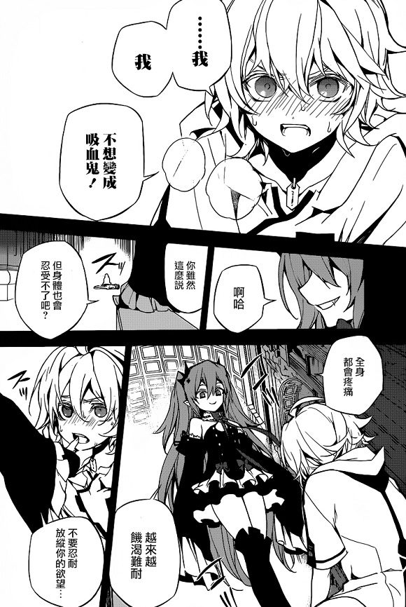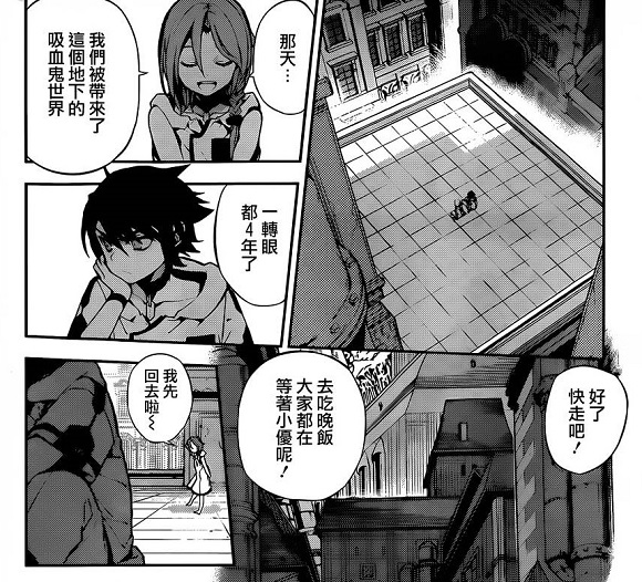 一轉眼四年過去了,過上被當成家畜而囚禁在地底的生活上,優一郎和米迦爾也策畫了從中逃出去的方法,不管是犧牲血液還是尊嚴只為了保護家人從吸血鬼手中逃出去而已,那怕外面是人類已經毀滅的世界。