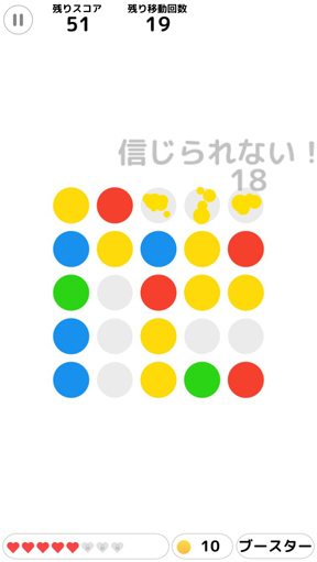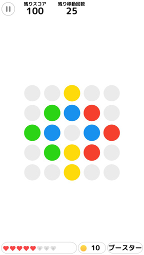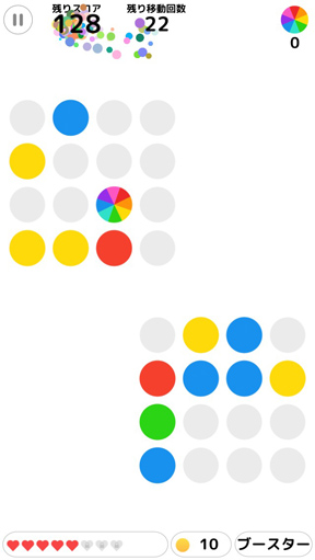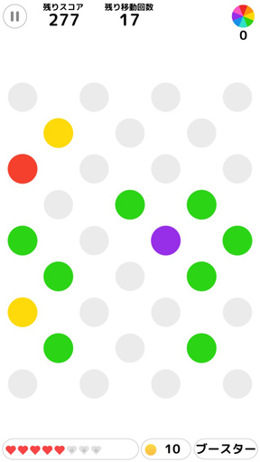 玩法很簡單,只要移動畫面上各種顏色的圓點,讓三個相同顏色的圓點連成一線的話就可以消掉它們。每次移動一次,畫面上就會出現更多的圓點,所以必須有效率的消除,不然最後整個畫面就會被圓點們佔滿。除此之外,也會有藉由限制移動次數達成目標的關卡等等,遊戲方式非常多樣化。