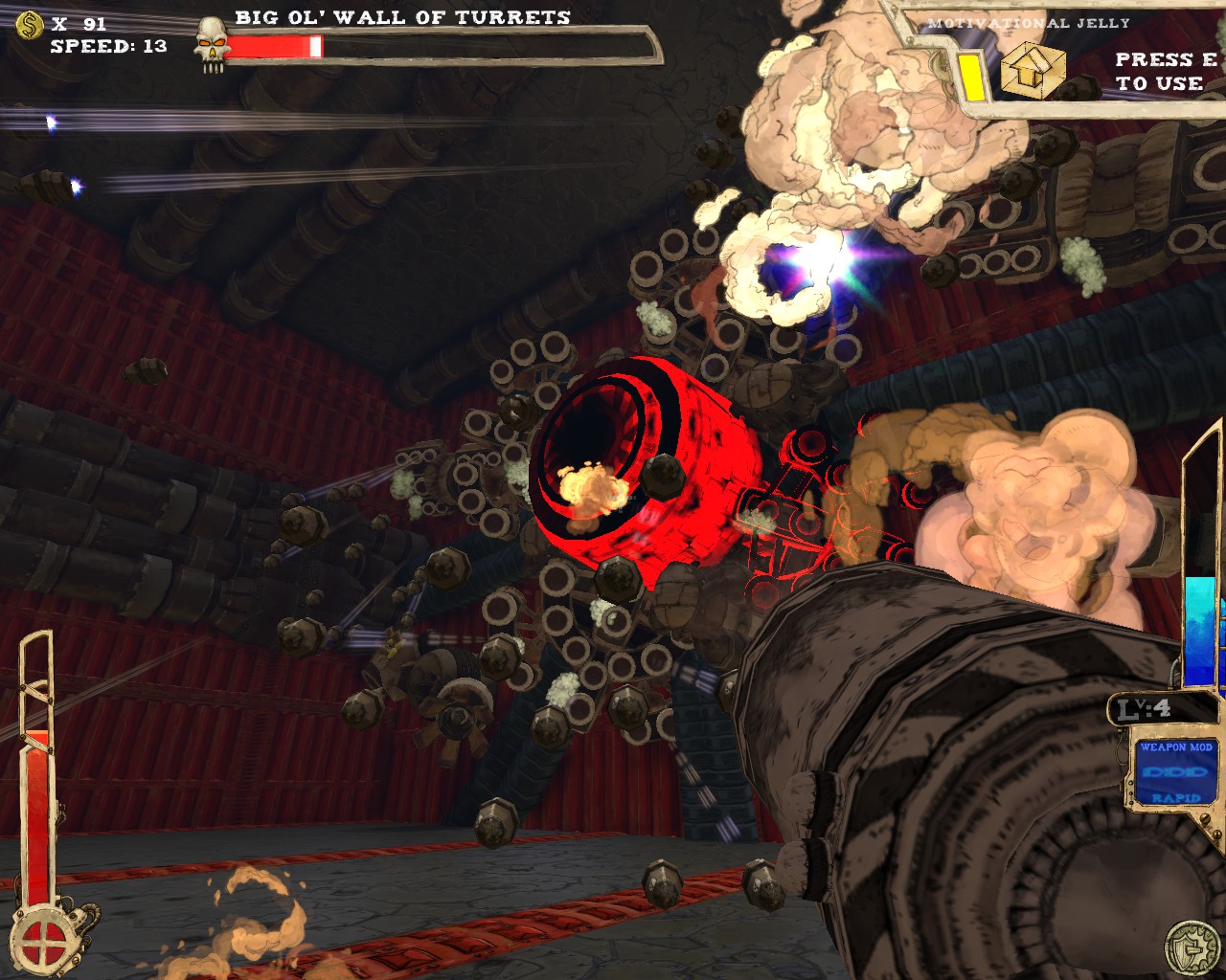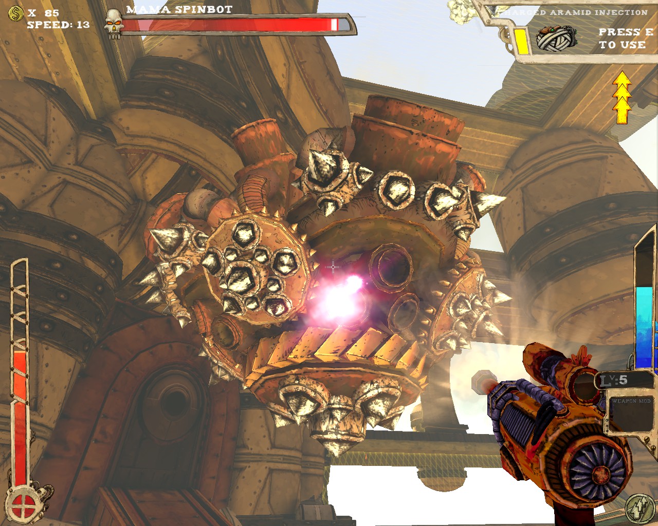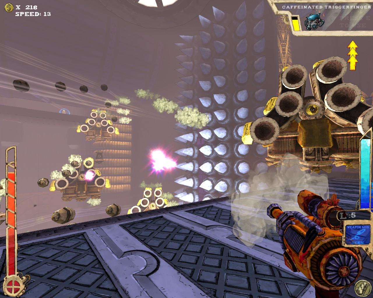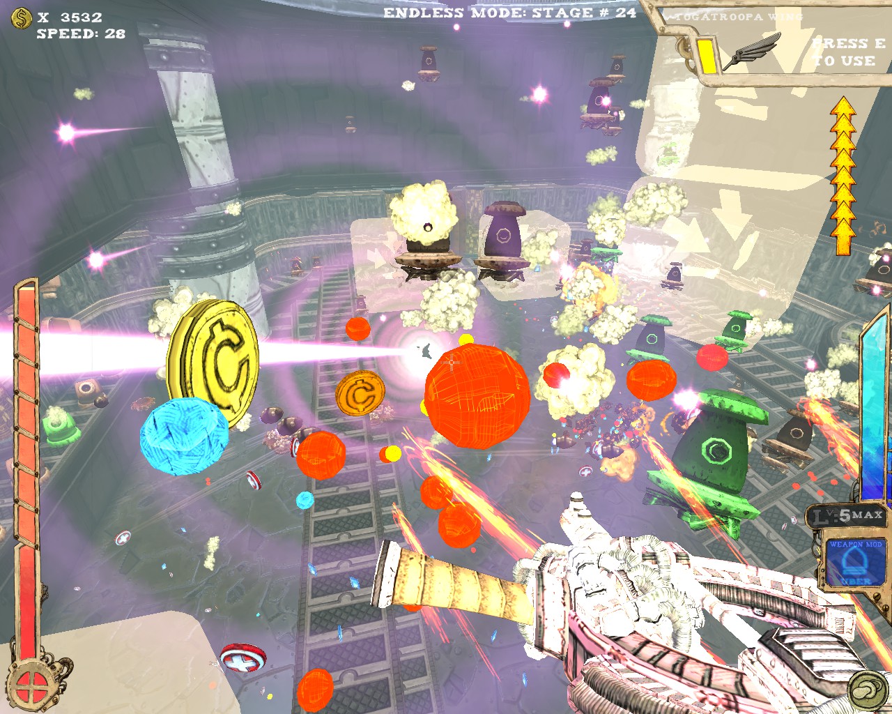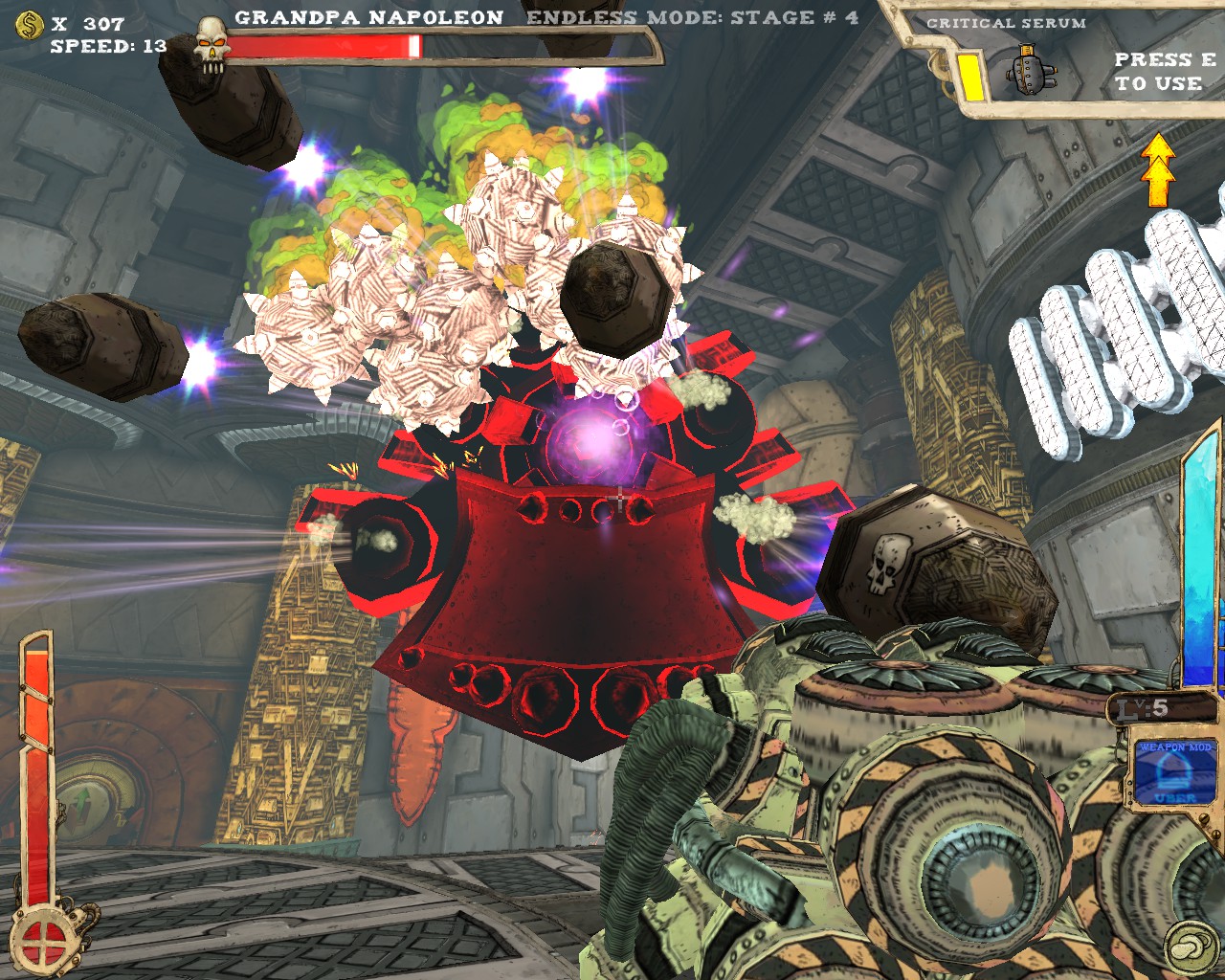 武器方面的設計也是非常奇特,本作有各種千奇百怪的怪槍,圓鋸槍、水砲槍、傳統大砲、弩槍、刺球槍、光球砲等等...,不斷進行遊戲以解鎖各種槍枝。武器還隨著拾取道具升級,使得火力更兇猛、砲彈更大顆,但凡是受到傷害會使武器經驗受損甚至降級。另外BOSS死亡時也有機會掉落武器MOD,為手中武器增加不同能力,例如爆炸彈、追蹤彈、射速提升、彈跳彈、超級子彈等等。可惜的是,許多武器性質太過類似,玩法變化性因此略為受限。