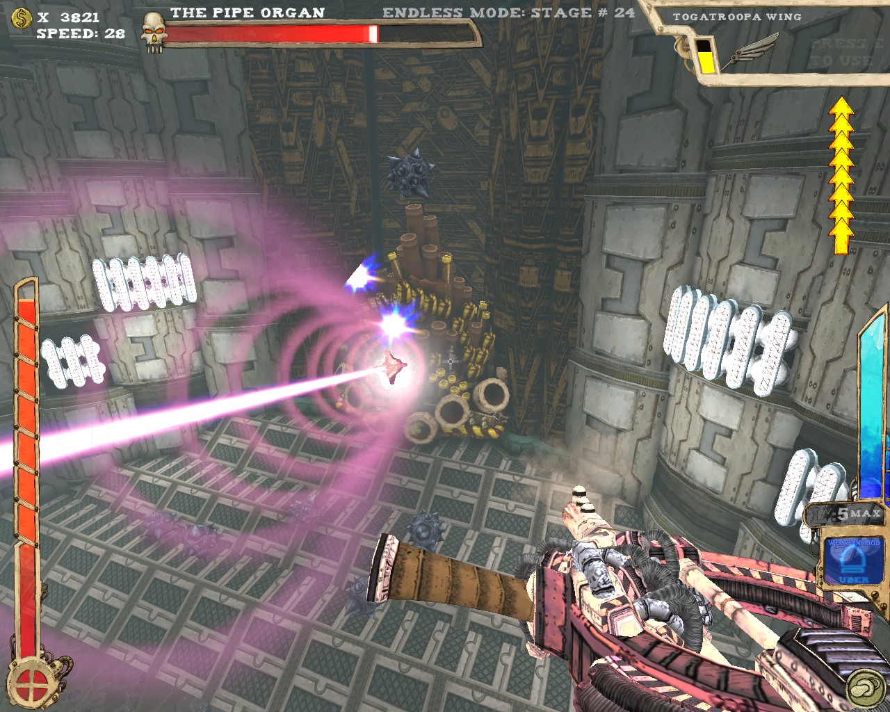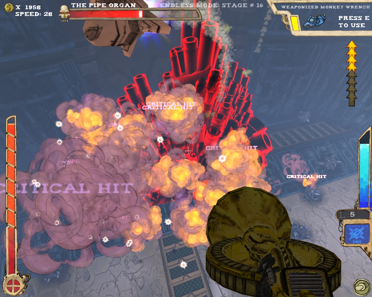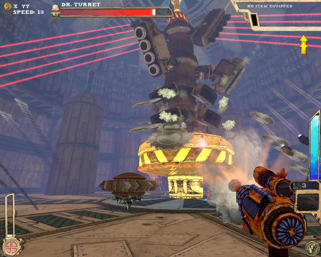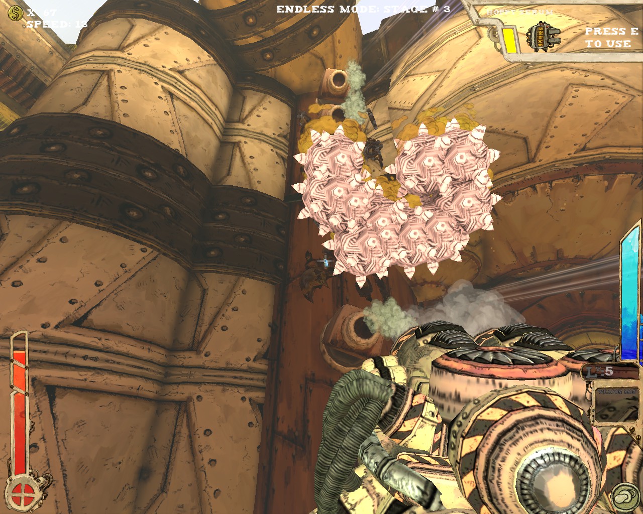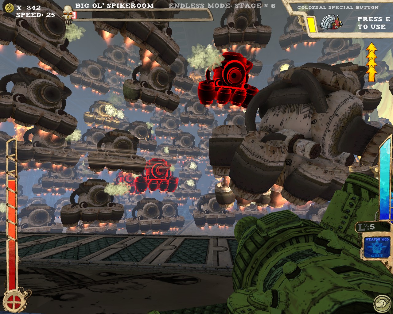 武器方面的設計也是非常奇特,本作有各種千奇百怪的怪槍,圓鋸槍、水砲槍、傳統大砲、弩槍、刺球槍、光球砲等等...,不斷進行遊戲以解鎖各種槍枝。武器還隨著拾取道具升級,使得火力更兇猛、砲彈更大顆,但凡是受到傷害會使武器經驗受損甚至降級。另外BOSS死亡時也有機會掉落武器MOD,為手中武器增加不同能力,例如爆炸彈、追蹤彈、射速提升、彈跳彈、超級子彈等等。可惜的是,許多武器性質太過類似,玩法變化性因此略為受限。