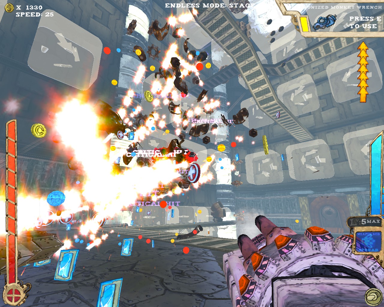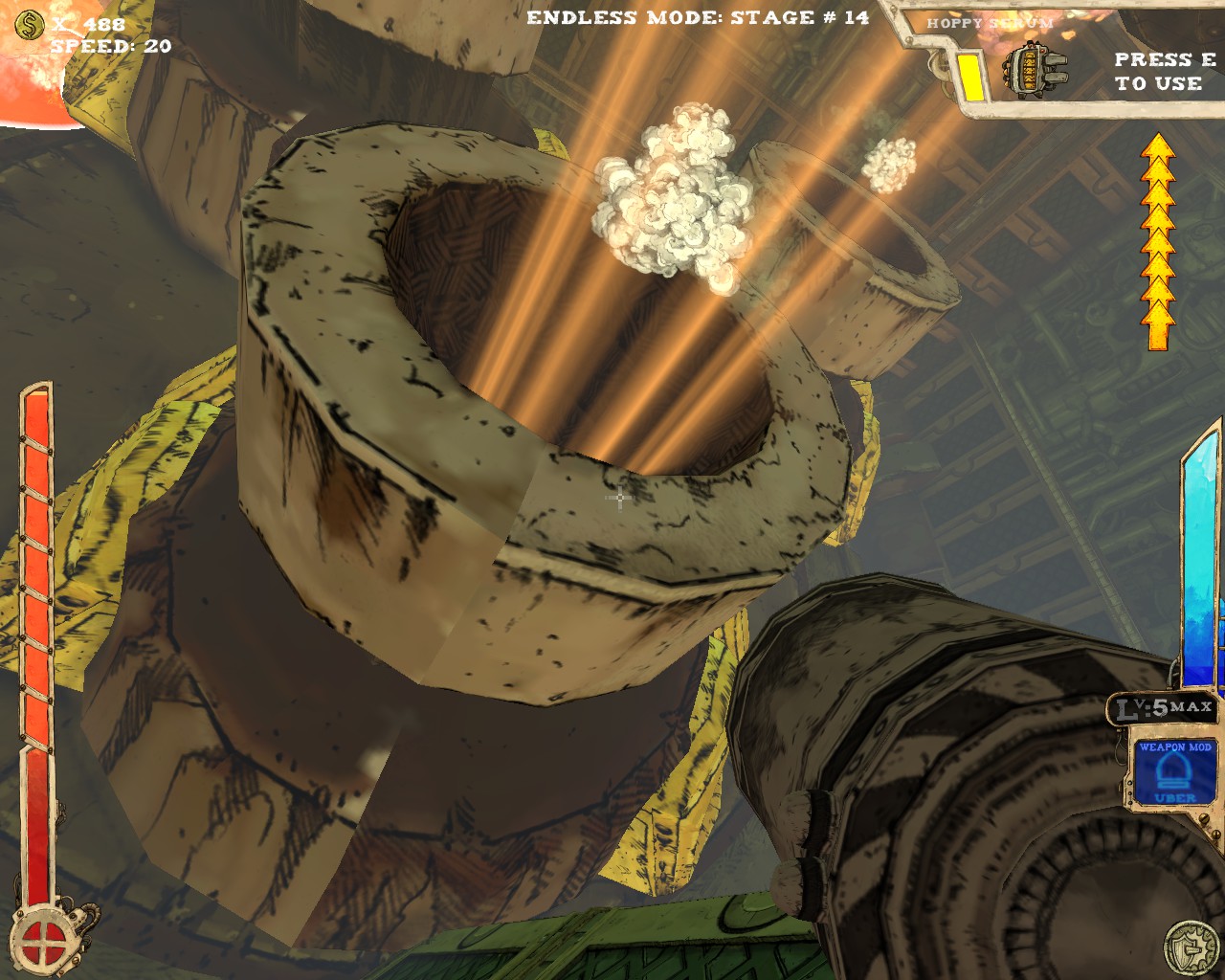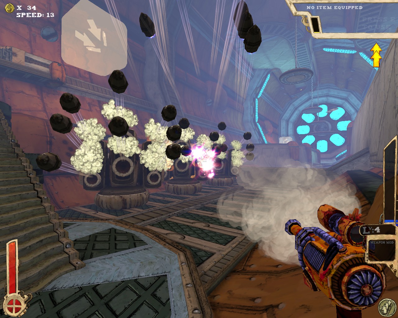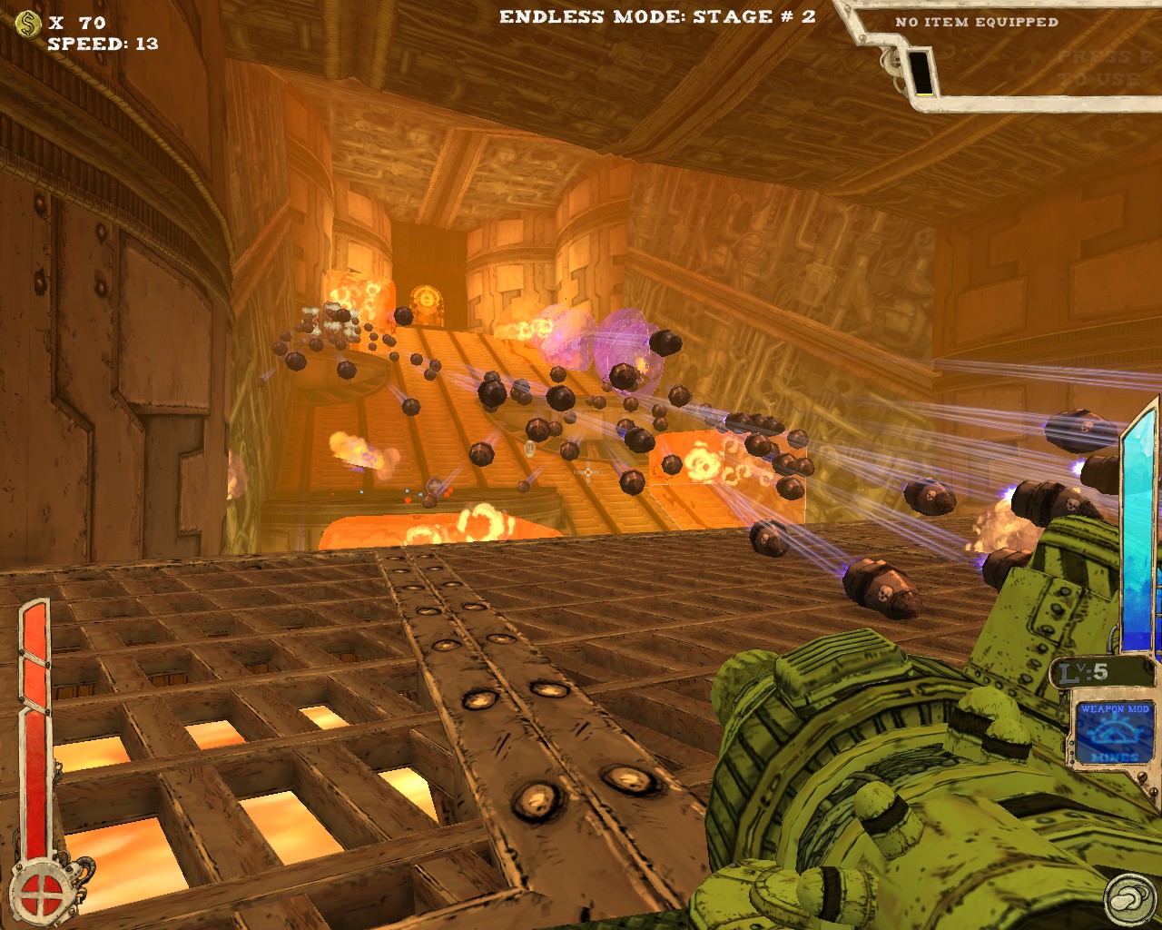 武器方面的設計也是非常奇特,本作有各種千奇百怪的怪槍,圓鋸槍、水砲槍、傳統大砲、弩槍、刺球槍、光球砲等等...,不斷進行遊戲以解鎖各種槍枝。武器還隨著拾取道具升級,使得火力更兇猛、砲彈更大顆,但凡是受到傷害會使武器經驗受損甚至降級。另外BOSS死亡時也有機會掉落武器MOD,為手中武器增加不同能力,例如爆炸彈、追蹤彈、射速提升、彈跳彈、超級子彈等等。可惜的是,許多武器性質太過類似,玩法變化性因此略為受限。
