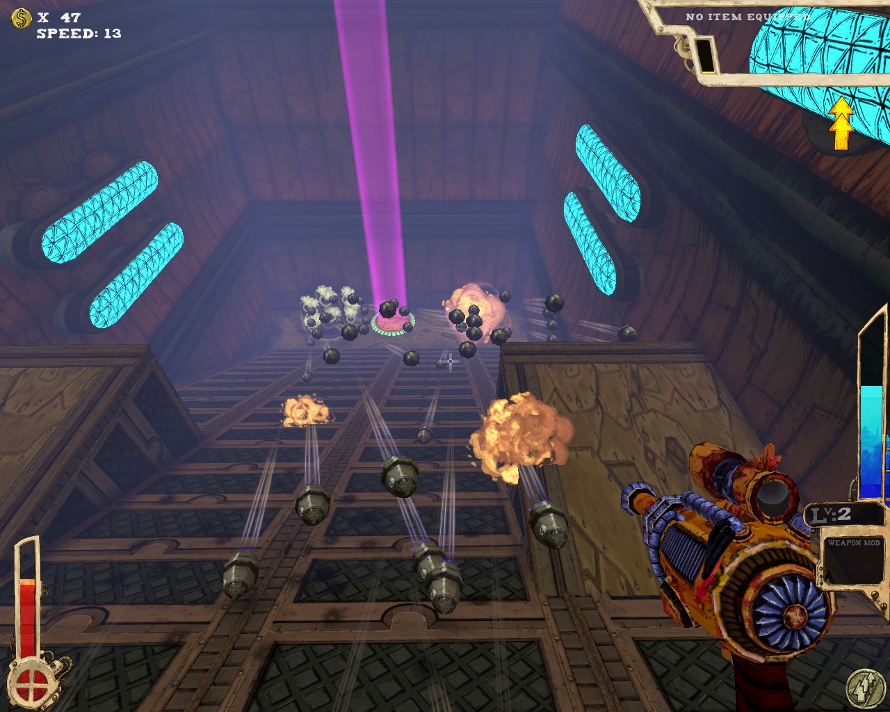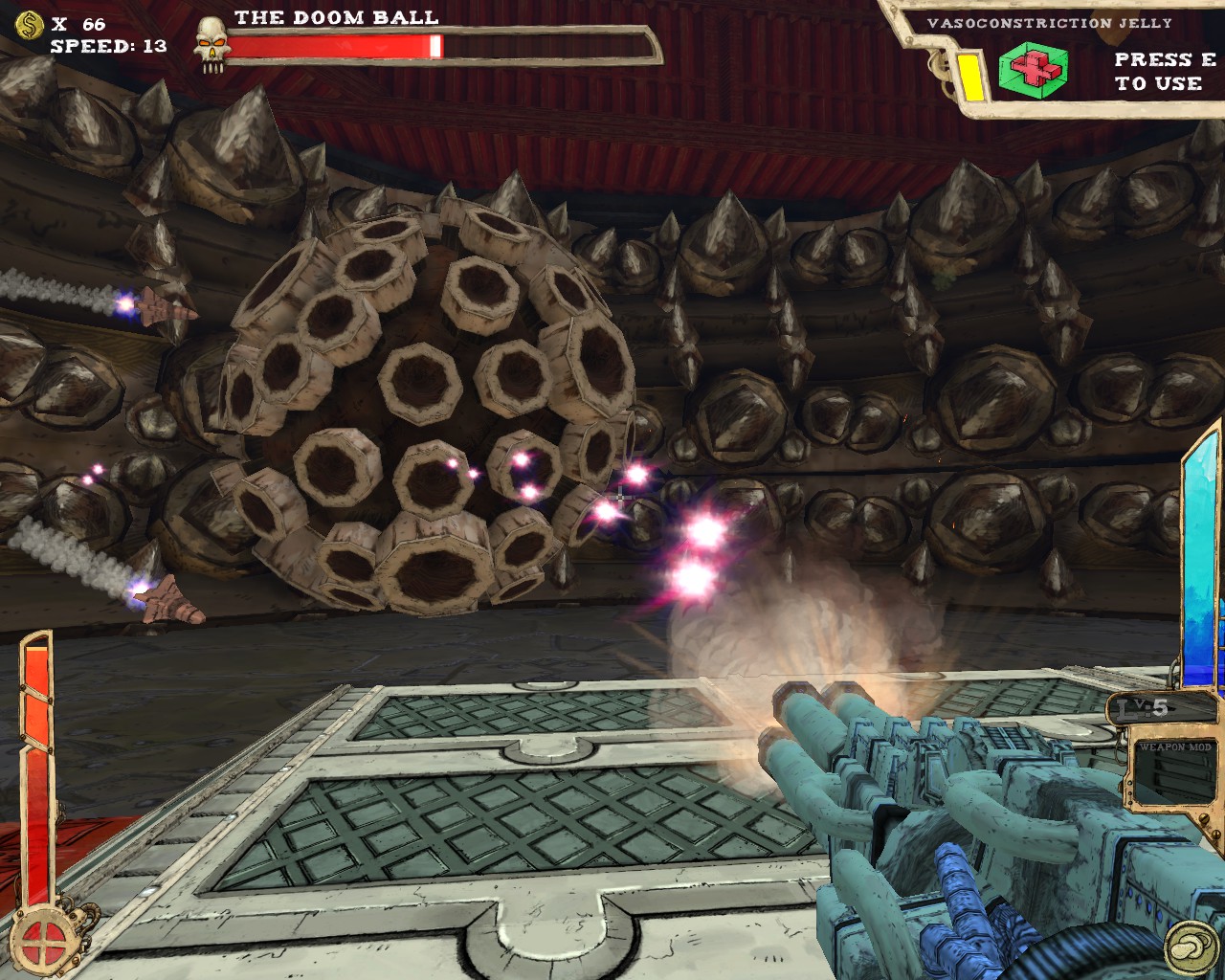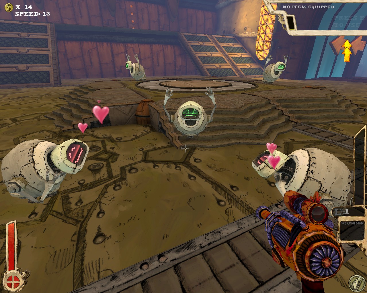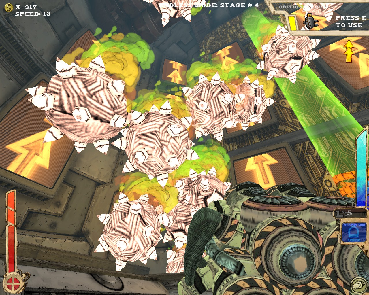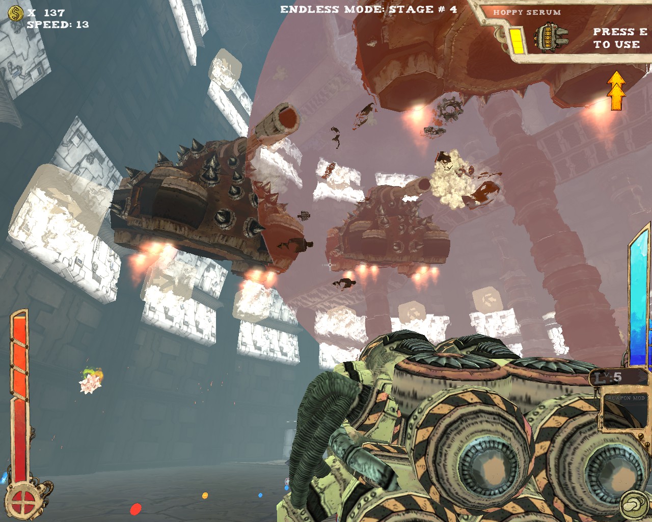 武器方面的設計也是非常奇特,本作有各種千奇百怪的怪槍,圓鋸槍、水砲槍、傳統大砲、弩槍、刺球槍、光球砲等等...,不斷進行遊戲以解鎖各種槍枝。武器還隨著拾取道具升級,使得火力更兇猛、砲彈更大顆,但凡是受到傷害會使武器經驗受損甚至降級。另外BOSS死亡時也有機會掉落武器MOD,為手中武器增加不同能力,例如爆炸彈、追蹤彈、射速提升、彈跳彈、超級子彈等等。可惜的是,許多武器性質太過類似,玩法變化性因此略為受限。