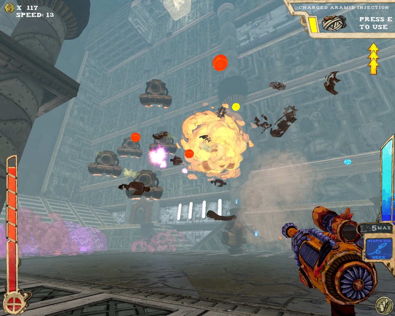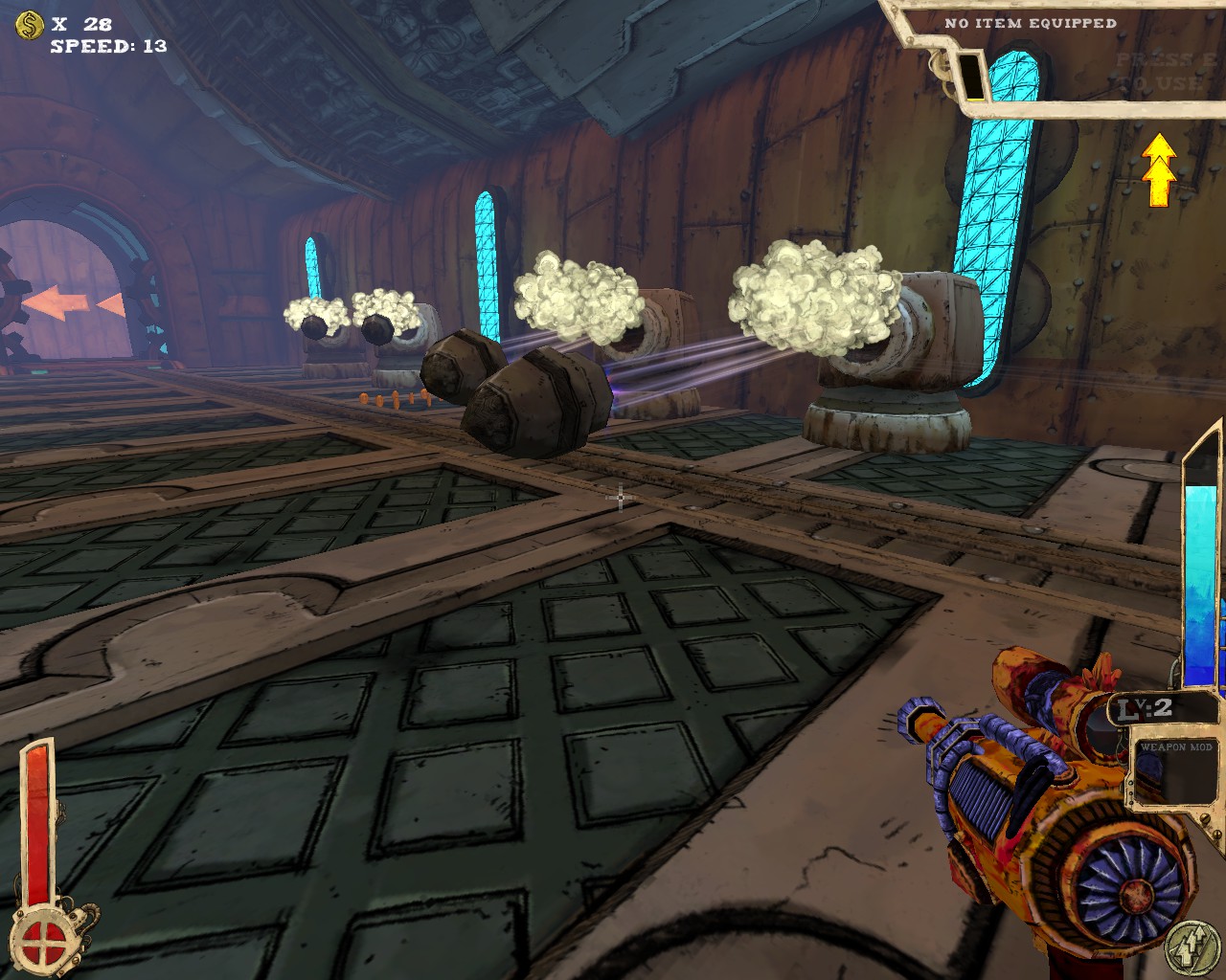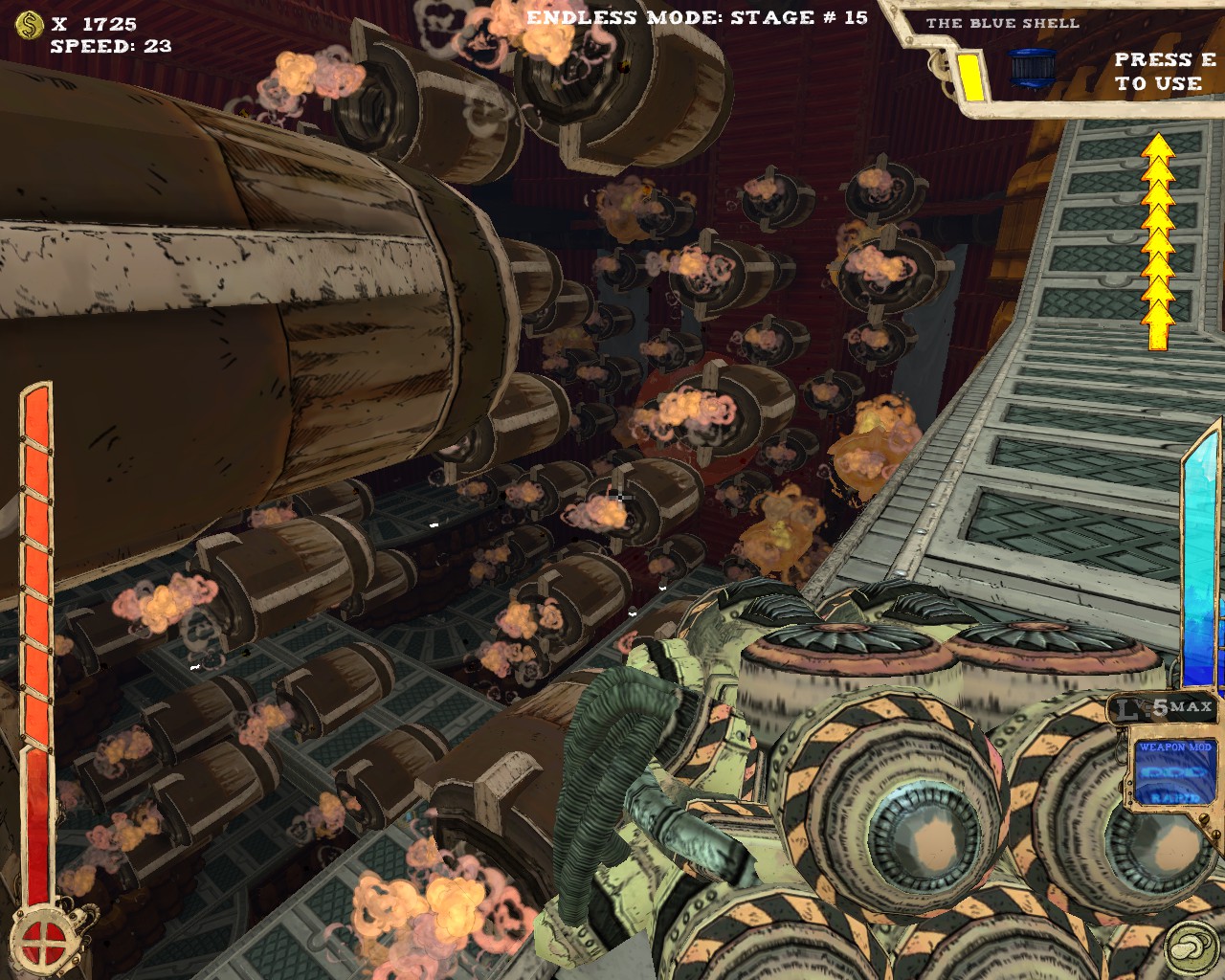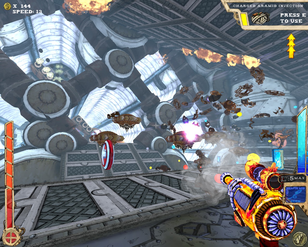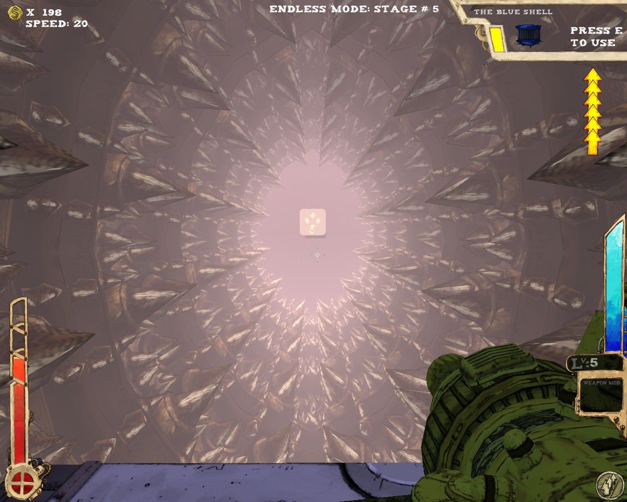 武器方面的設計也是非常奇特,本作有各種千奇百怪的怪槍,圓鋸槍、水砲槍、傳統大砲、弩槍、刺球槍、光球砲等等...,不斷進行遊戲以解鎖各種槍枝。武器還隨著拾取道具升級,使得火力更兇猛、砲彈更大顆,但凡是受到傷害會使武器經驗受損甚至降級。另外BOSS死亡時也有機會掉落武器MOD,為手中武器增加不同能力,例如爆炸彈、追蹤彈、射速提升、彈跳彈、超級子彈等等。可惜的是,許多武器性質太過類似,玩法變化性因此略為受限。