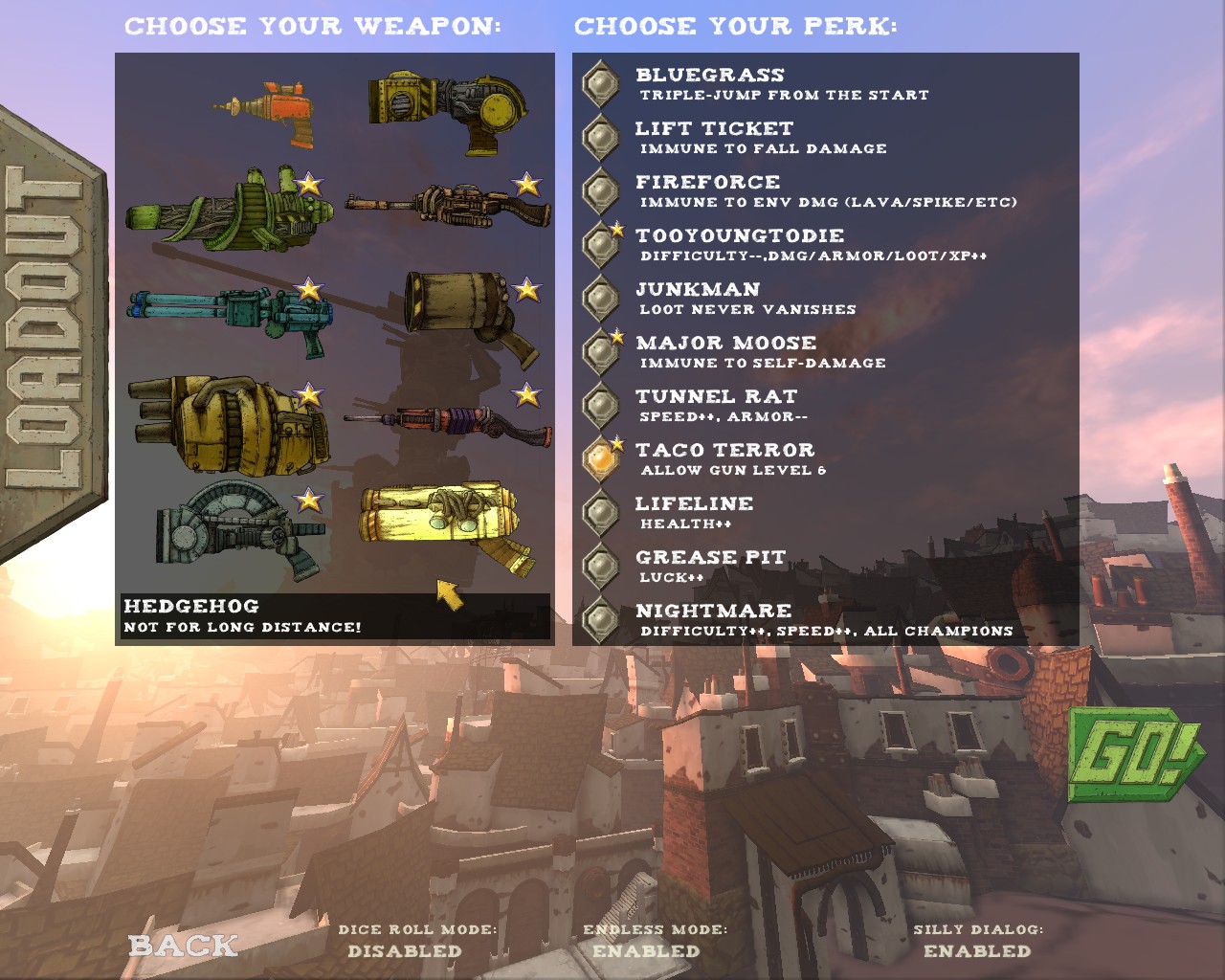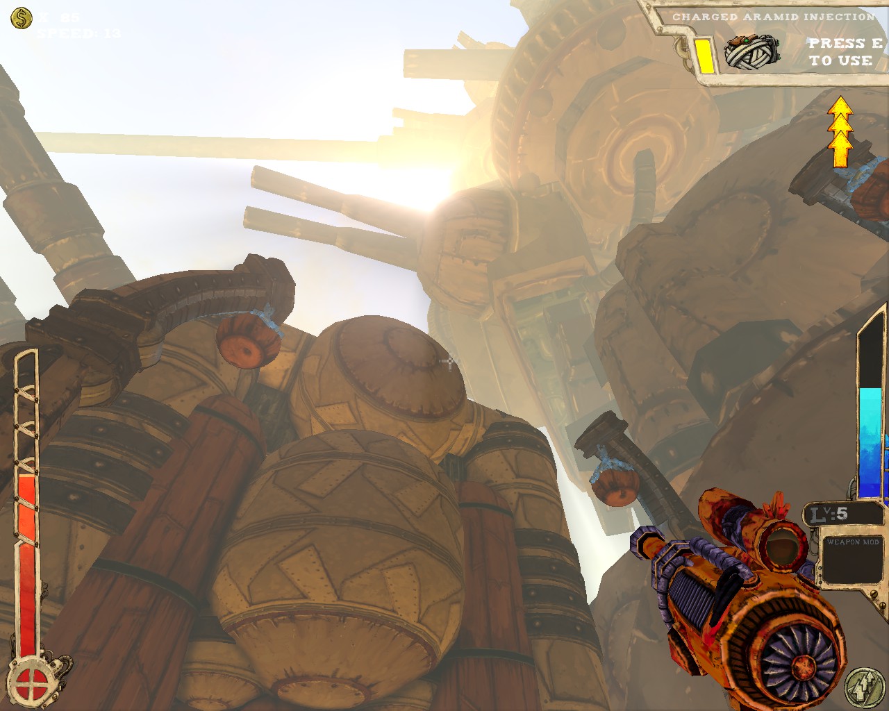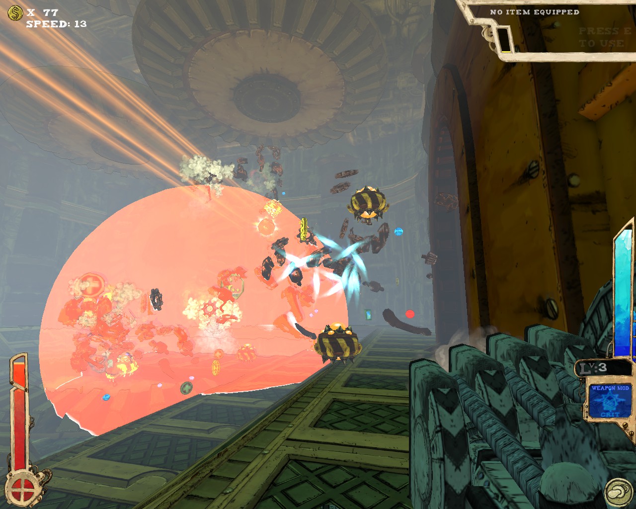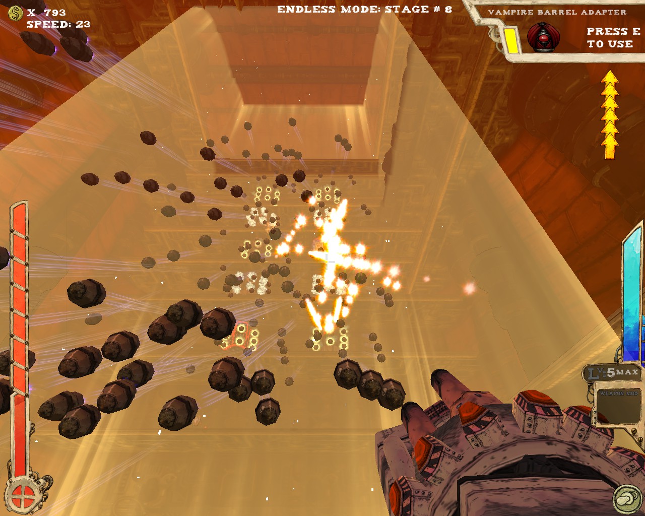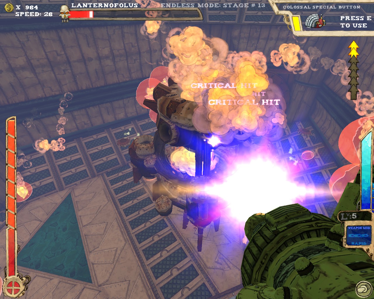 武器方面的設計也是非常奇特,本作有各種千奇百怪的怪槍,圓鋸槍、水砲槍、傳統大砲、弩槍、刺球槍、光球砲等等...,不斷進行遊戲以解鎖各種槍枝。武器還隨著拾取道具升級,使得火力更兇猛、砲彈更大顆,但凡是受到傷害會使武器經驗受損甚至降級。另外BOSS死亡時也有機會掉落武器MOD,為手中武器增加不同能力,例如爆炸彈、追蹤彈、射速提升、彈跳彈、超級子彈等等。可惜的是,許多武器性質太過類似,玩法變化性因此略為受限。