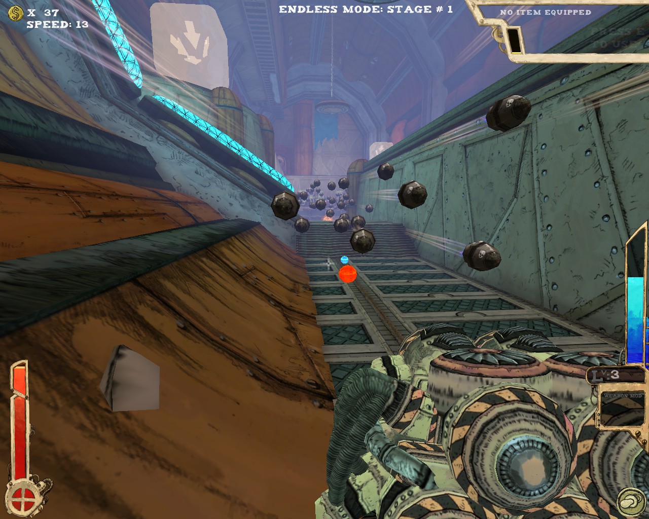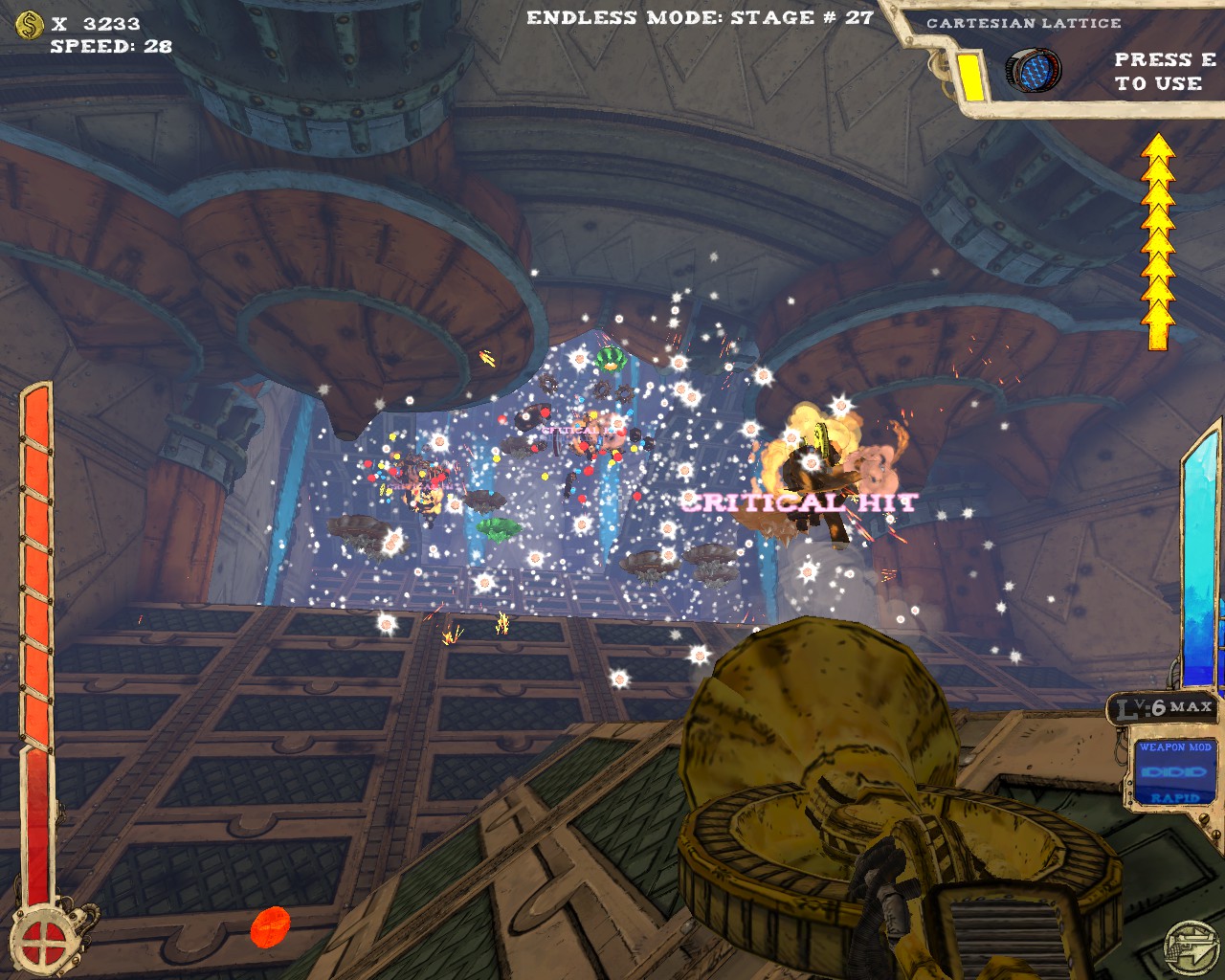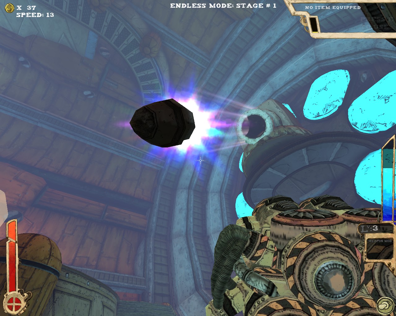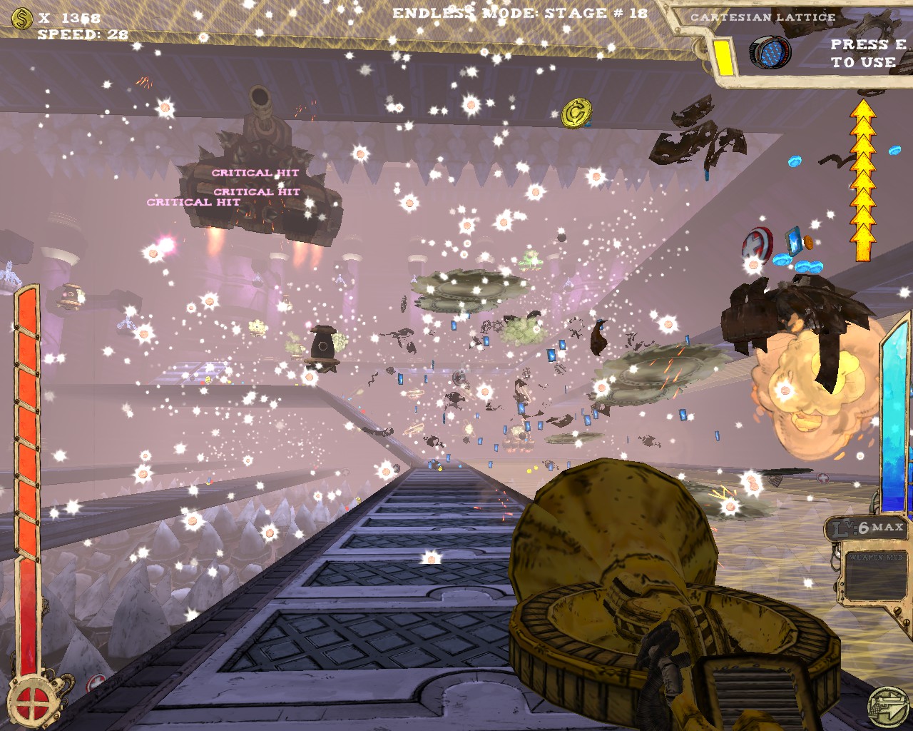 最讓我讚賞的是本作提供了無盡模式(endless),不少roguelike的遊戲都有類似的設計。打通最後一關後,提升整體難度再從第一關開始,無限輪迴看你能撐多久。除了不斷挑戰更高難度以外,由於人物可持續提升能力,遊玩數輪後人物性能會大幅提升,尤其是機動性方面更是可以突破天際,25段跳、一躍3層樓高、高速移動,你會發現槍戰體驗更近一步昇華至空中戰,利用多段跳在空中遊走、S形空中移動,由上而下宰制敵人,別有一番趣味。當然,愈後期敵人愈棘手,除了傷害不斷翻倍,敵人的移動速度、砲彈速度也會不斷提升,30關以後一不小心就被秒殺。