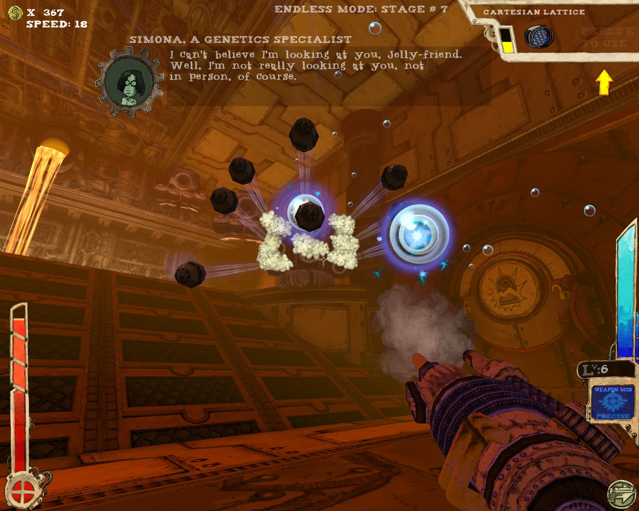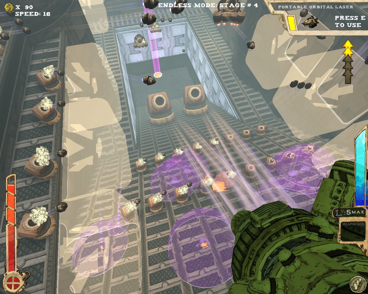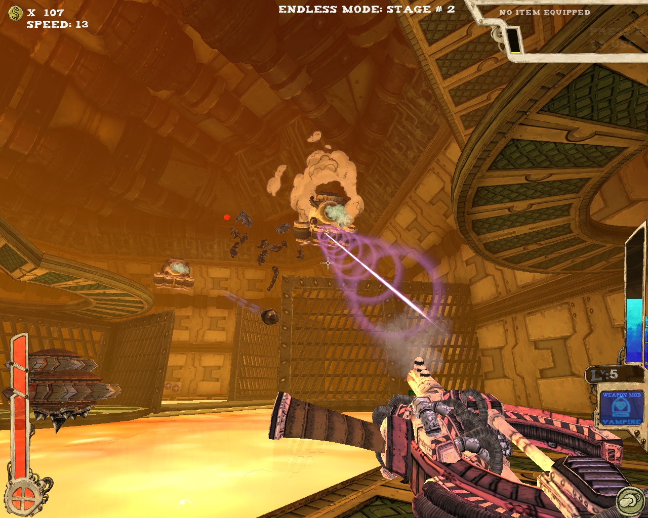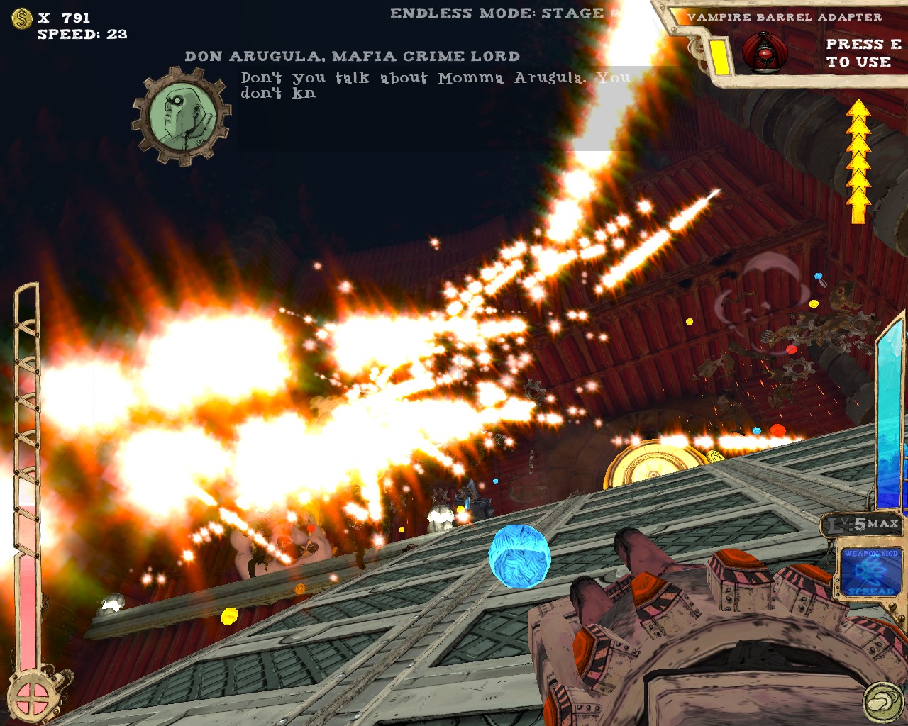 最讓我讚賞的是本作提供了無盡模式(endless),不少roguelike的遊戲都有類似的設計。打通最後一關後,提升整體難度再從第一關開始,無限輪迴看你能撐多久。除了不斷挑戰更高難度以外,由於人物可持續提升能力,遊玩數輪後人物性能會大幅提升,尤其是機動性方面更是可以突破天際,25段跳、一躍3層樓高、高速移動,你會發現槍戰體驗更近一步昇華至空中戰,利用多段跳在空中遊走、S形空中移動,由上而下宰制敵人,別有一番趣味。當然,愈後期敵人愈棘手,除了傷害不斷翻倍,敵人的移動速度、砲彈速度也會不斷提升,30關以後一不小心就被秒殺。