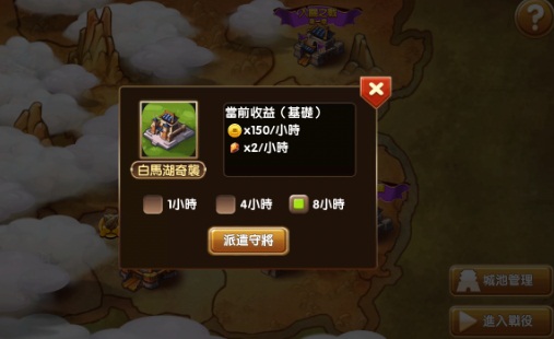 只要在劇情關卡中推過每一個地區章節的主城,便能夠派將領駐守攻下的城池。而每個城池滿員最多可讓五名英雄進駐,可選擇駐守一小時,四小時或八小時來獲得城池中的資源。也因此當你推過的城池更多更高級時,就可以獲得更多的資源,但相對的就得分派陣營中的更多的武將英雄來駐守城池。所以不用擔心太多將領無事可做,只怕不夠將領來駐守更多的城池。所以陣中的武將除了隨時候傳上陣出兵之外,閒暇時駐守城池增加稅收來為主公累積更多的財富,就能讓自己的軍容更加的精良強盛。