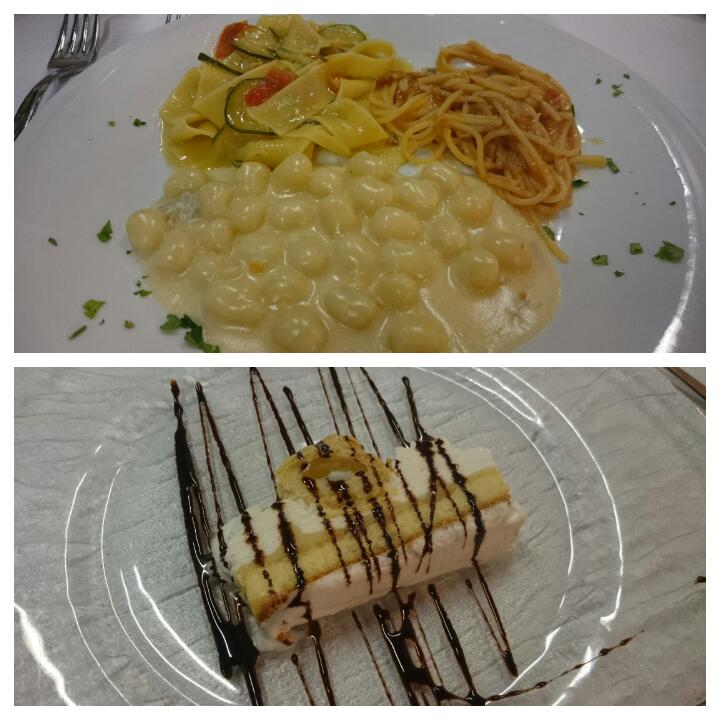 這趟旅行的餐點,大多數都是採「三道式」:前菜、主餐、甜點。每頓餐都有配酒跟水,其中幾餐比較高級有更多道菜。而在臺灣被當作主餐的義大利麵在這是屬於「前菜」,通常都是吃了一盤義大利麵後,繼續吃以肉類為主的「主餐」,因此在這十幾天中幾乎天天吃義大利麵,雖然有各式口味的麵,但這也讓我回到臺灣後足足一個多月不想再吃義大利麵XD