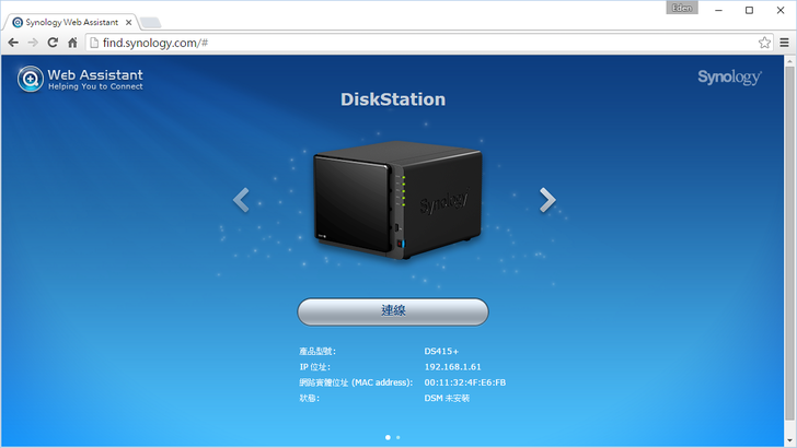 接著把網路線和電源線接好並且開機,電源鍵會亮藍燈,而運作中的硬碟會亮綠燈;如果NAS正在運作會亮綠燈,待設定或是休眠中則會亮橘燈。